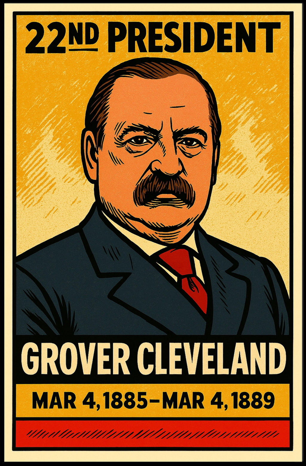 Detailed design highlighting Grover Cleveland in an inked comic style