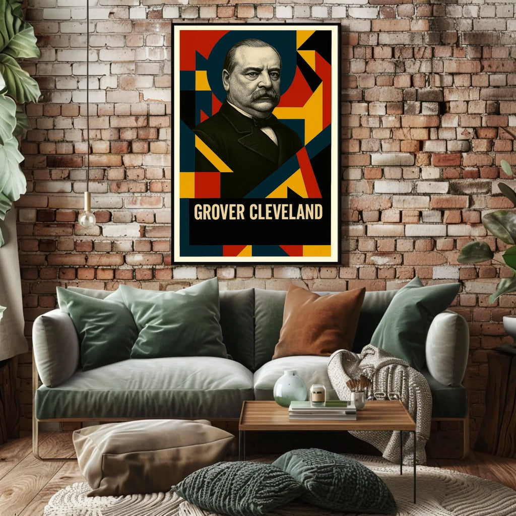 This poster presents Grover Cleveland, the 24th president of the USA, in American politics context for wall display in an abstract pop design.