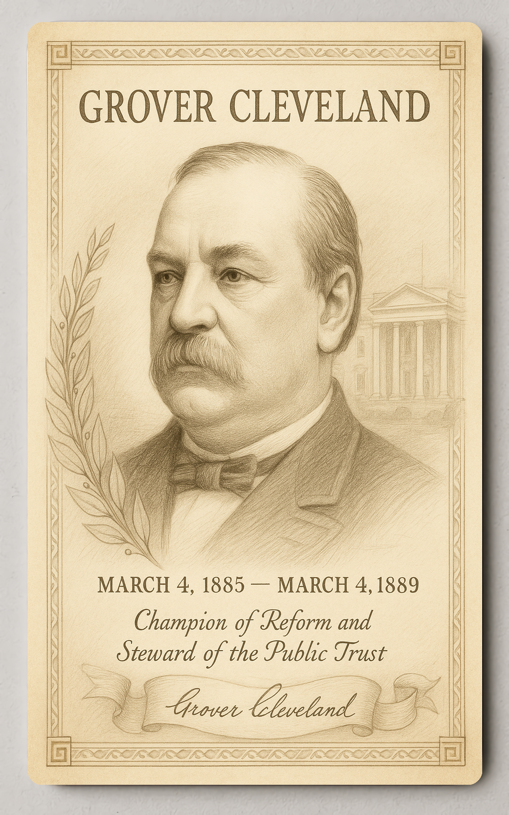 This trading card features a finely detailed sepia pencil portrait of Grover Cleveland framed by an ornate classical border, laurel accents, and the historic dates of his administration. The design evokes the charm of antique engravings while delivering crisp, high-quality printing that looks stunning displayed on a shelf, in a frame, or within a curated trading-card collection.