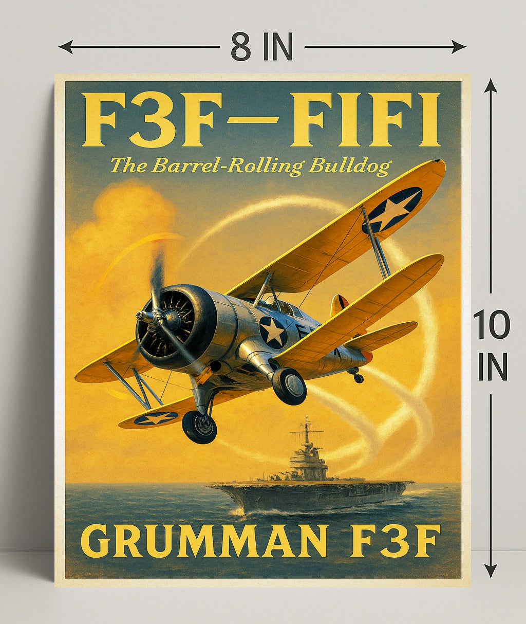 Capture the golden age of naval aviation with the Grumman F3F "The Barrel-Rolling Bulldog" Poster from PosterGoat — a striking vintage-style art print that blends minimalist design with bold, cinematic color. This poster showcases a dynamic biplane in mid-roll above an aircraft carrier, rendered in warm yellows and deep blues that bring motion and nostalgia to any room.