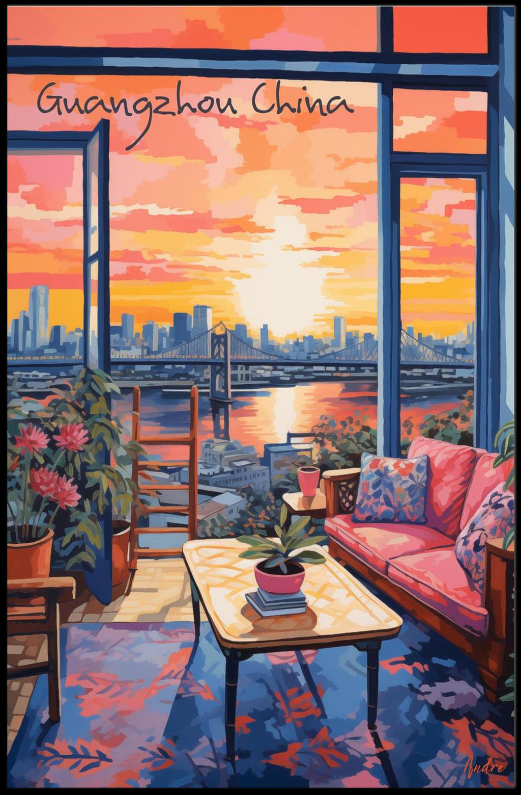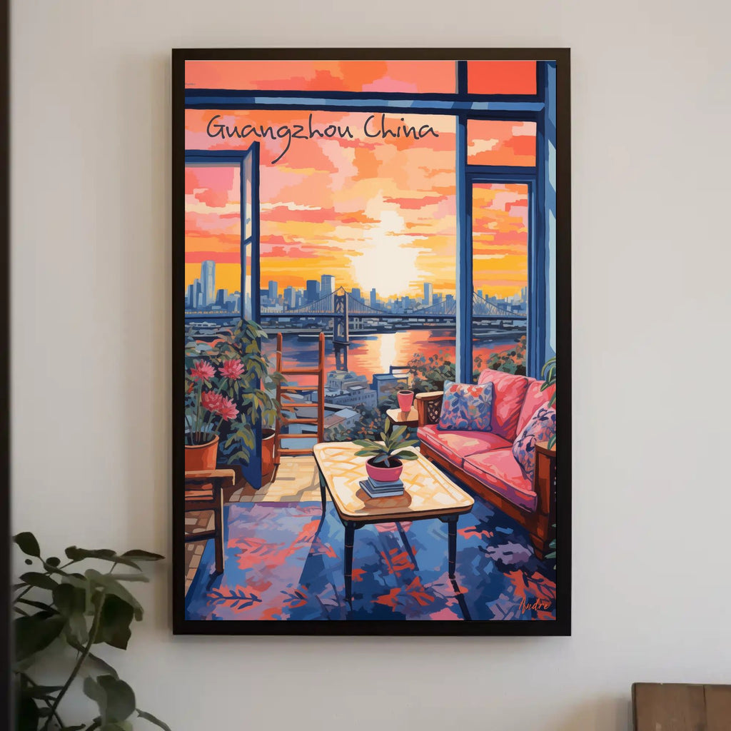 Bring home the glow of Guangzhou at dusk with the Guangzhou Sunset Cityscape with Cozy Interior Poster by PosterGoat — a vivid, minimalist artwork that frames the city’s modern skyline and iconic bridge through an open, plant-filled room bathed in warm orange and pink sunset hues.