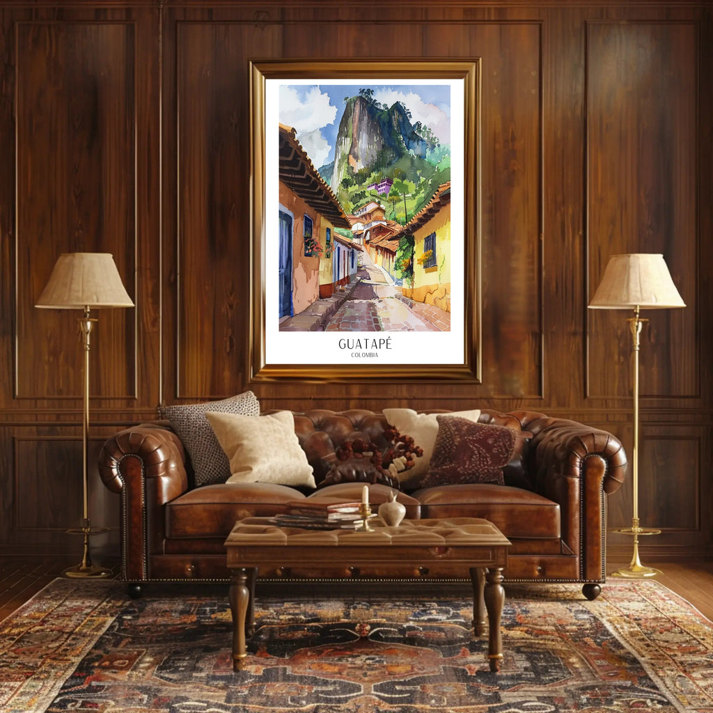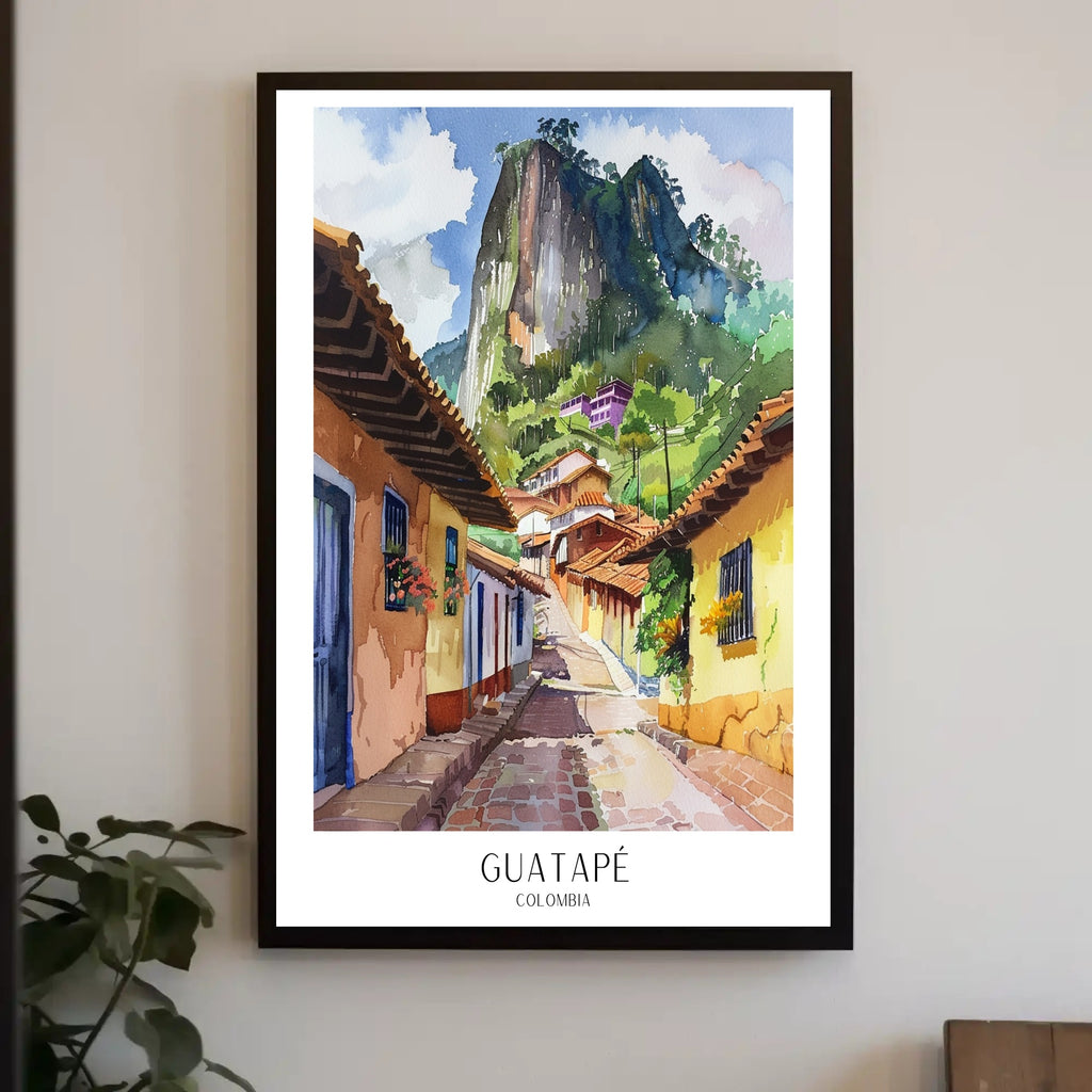 Immerse yourself in the picturesque beauty of Guatapé, Colombia, with this exquisite watercolor poster. It captures the heart of the village, highlighting vibrant streets adorned with colorful houses and lush flora. A masterpiece of tranquil charm, the artwork leads you along a cobblestone path, drawing your gaze toward the majestic rock formation, La Piedra del Peñol, cloaked in greenery. The fluid brushstrokes and vivid hues evoke a dreamy, inviting atmosphere that embodies Colombian culture and scenery. Perfect for travel enthusiasts, this poster conjures a sense of exploration and serene adventure, bringing a touch of Colombian allure to any space.