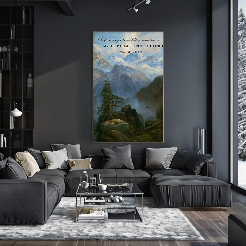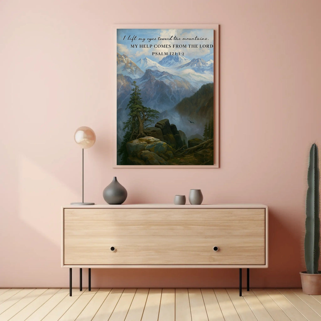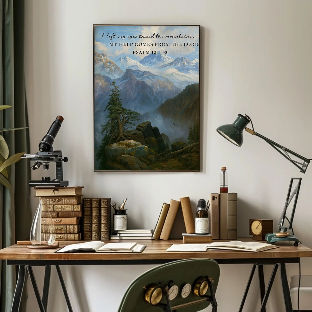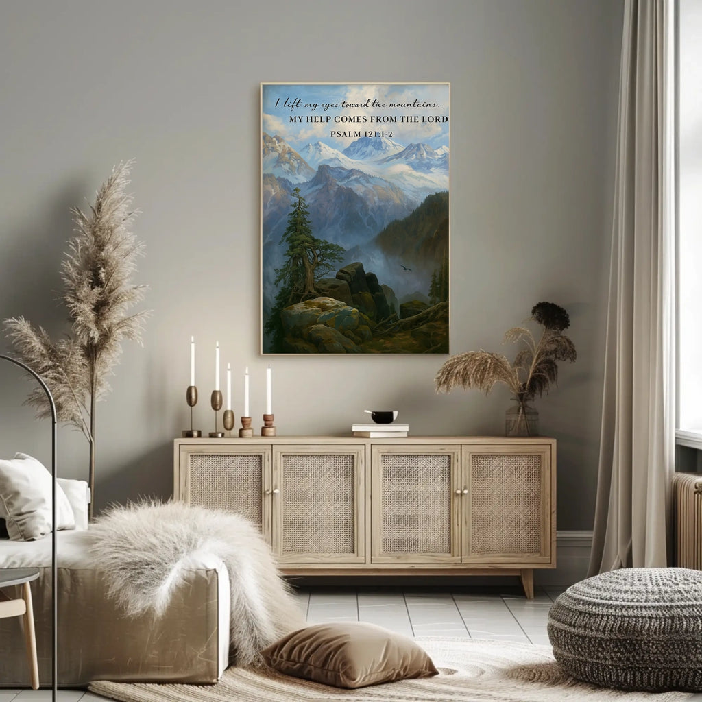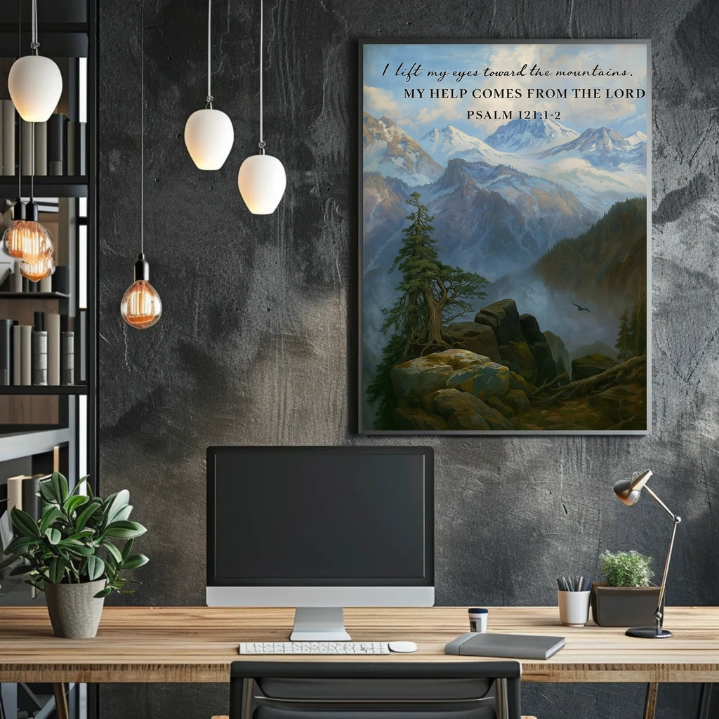Guidance from the Heights captures a tranquil mountain landscape paired with Psalm 121:1-2, a gentle reminder that divine support and guidance come from above. This inspirational poster brightens any room, inviting daily reflection and a renewed sense of purpose in home or office settings.