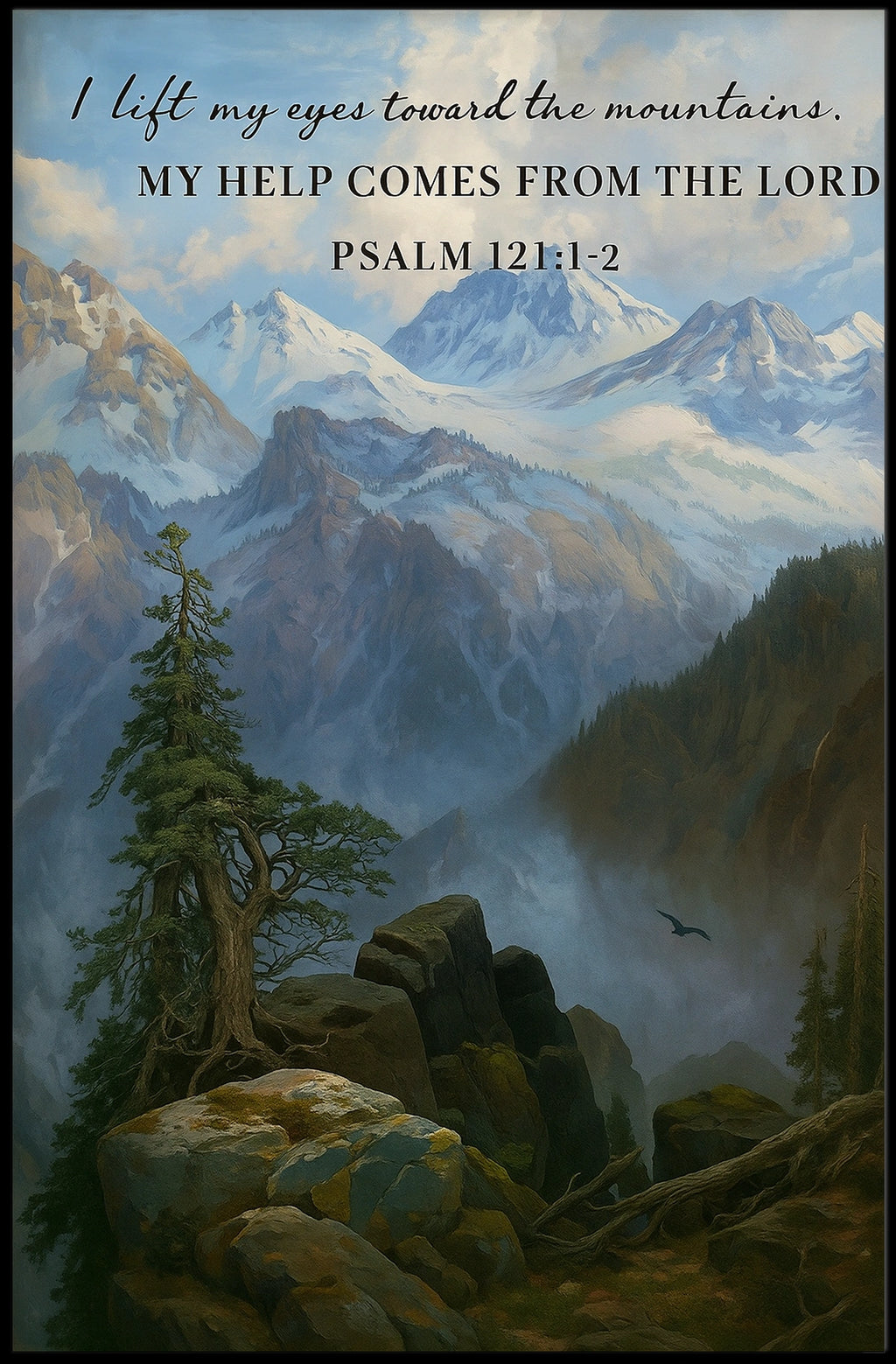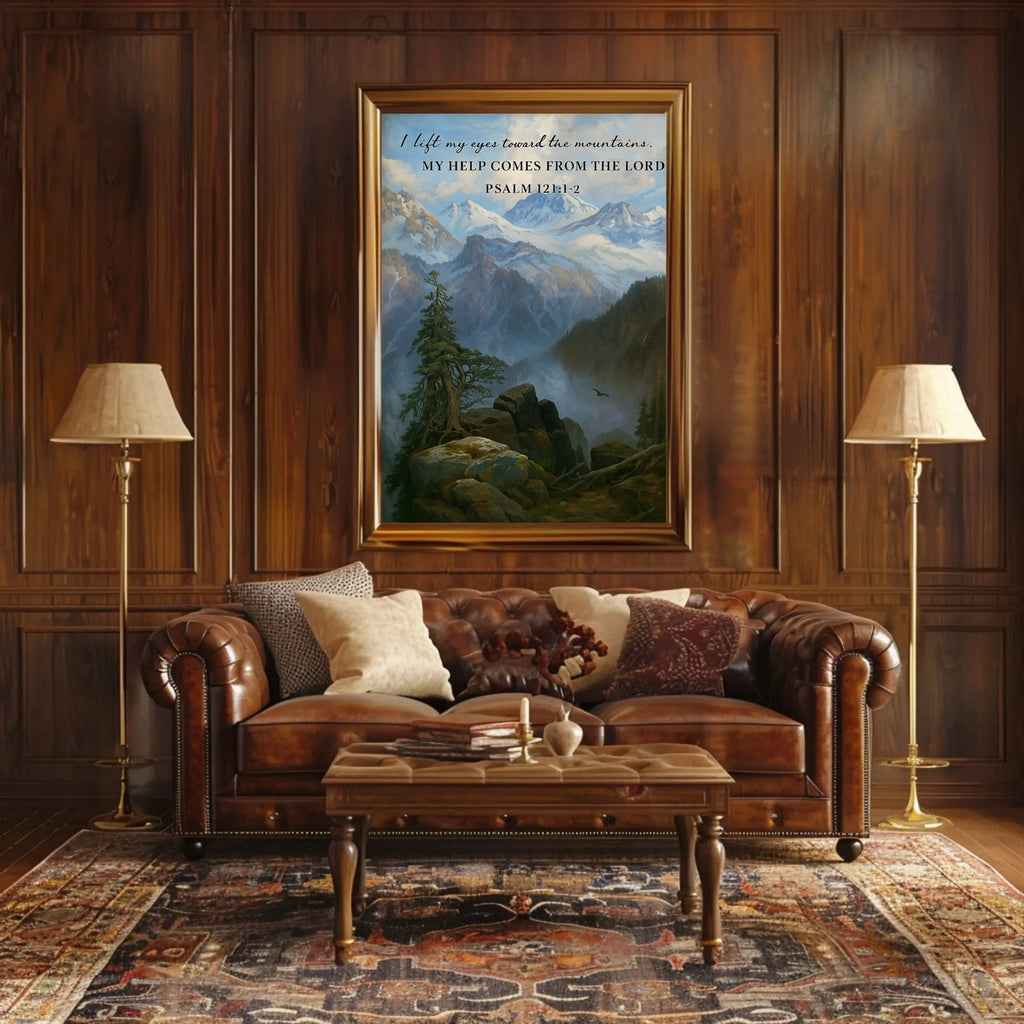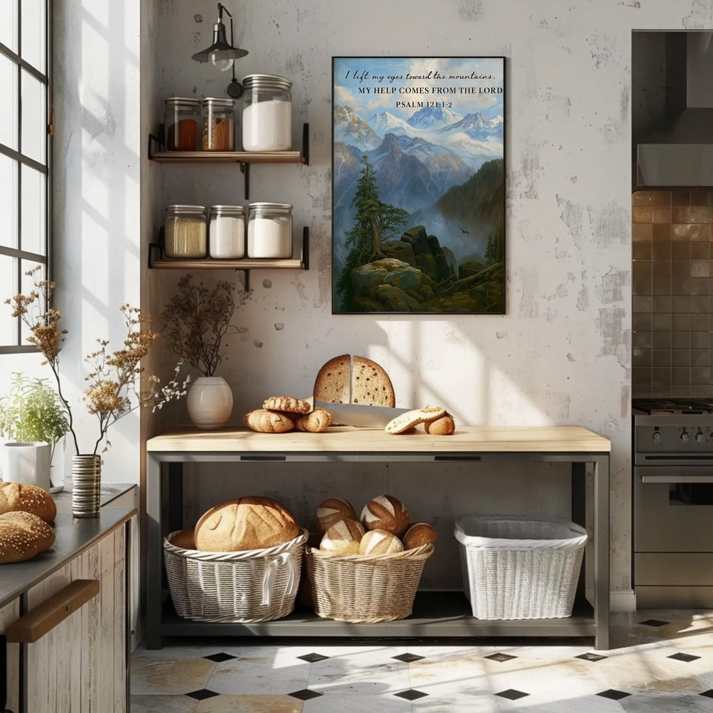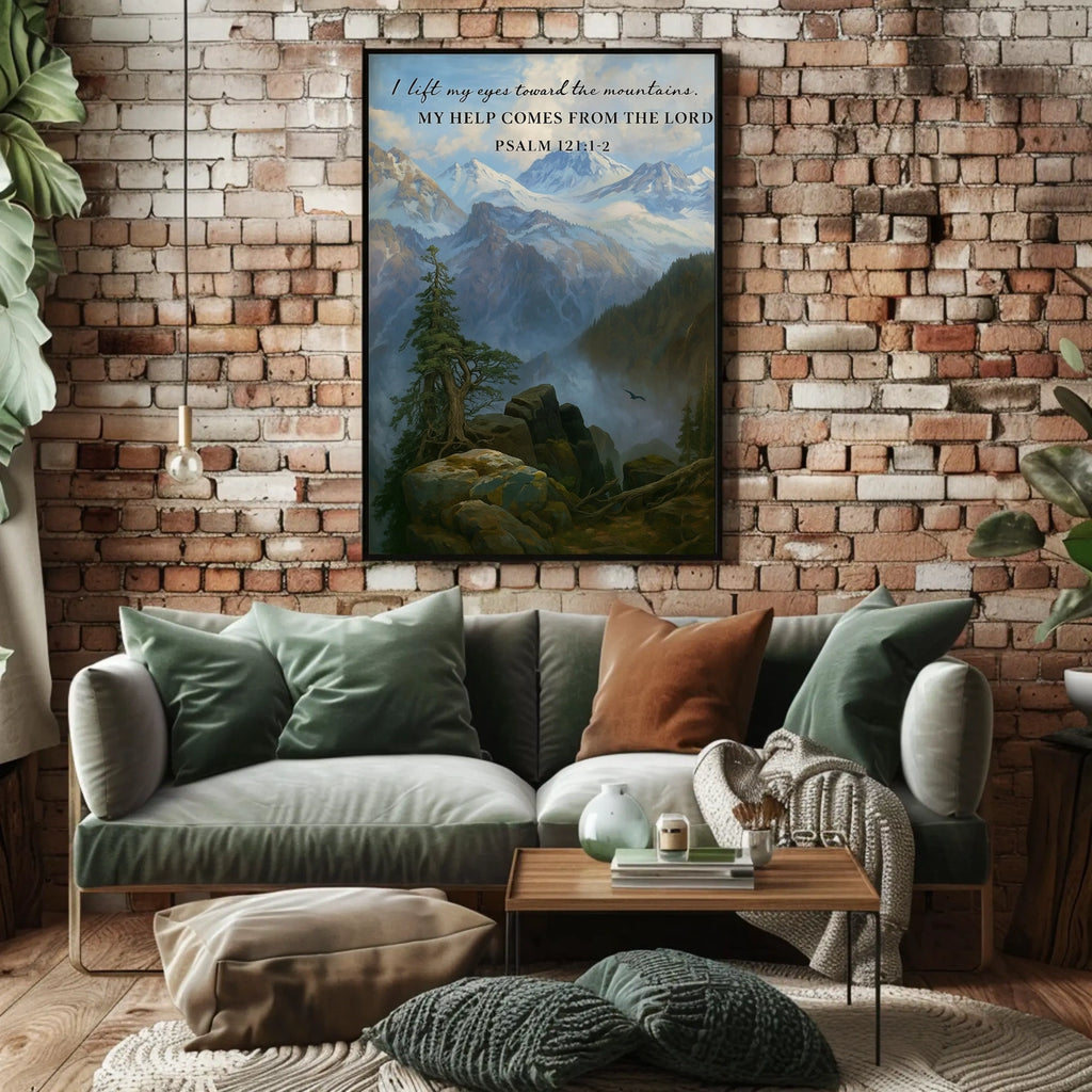 Guidance from the Heights captures a tranquil mountain landscape paired with Psalm 121:1-2, a gentle reminder that divine support and guidance come from above. This inspirational poster brightens any room, inviting daily reflection and a renewed sense of purpose in home or office settings.