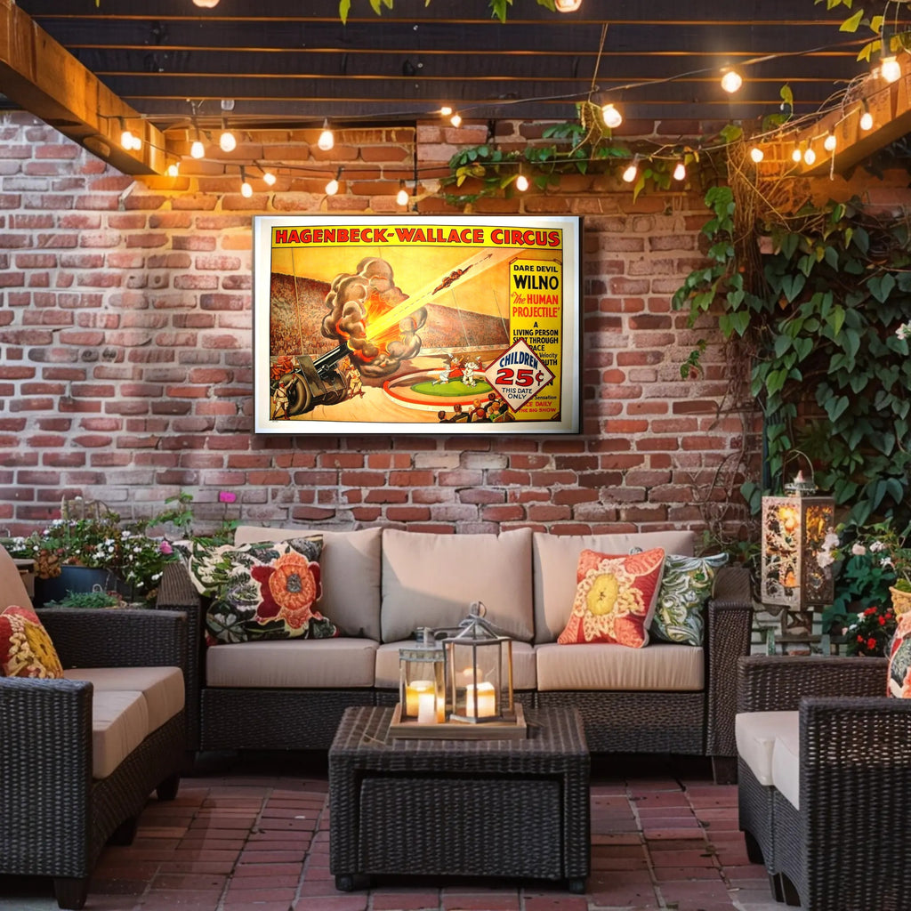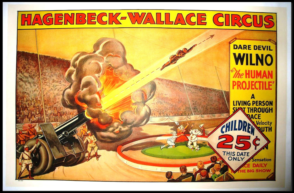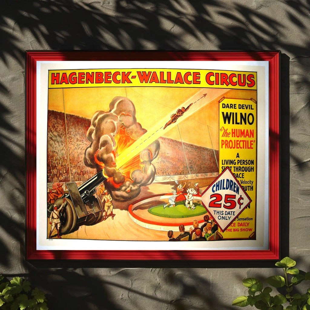 Hagenbeck-Wallace Circus – Daredevil Wilno Poster from PosterGoat brings vintage circus spectacle into your home with bold pop-art colors, striking typography, and action-packed illustration. This reproduction poster captures the dramatic moment of "Wilno — The Human Projectile" launched from a cannon, rendered in warm yellows, fiery oranges and retro reds that demand attention on any wall.
