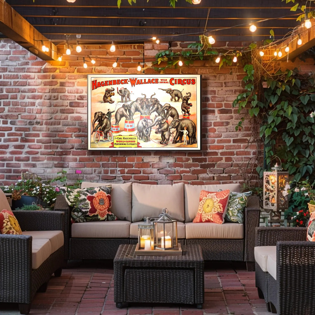 Bring a piece of classic showmanship to your walls with the Hagenbeck-Wallace Wild Animal Circus Poster from PosterGoat. This vintage-inspired print captures a lively parade of performing elephants — from a wheel-riding pachyderm to acrobats balancing on drums — rendered in warm sepia tones and bold retro lettering that instantly commands attention.