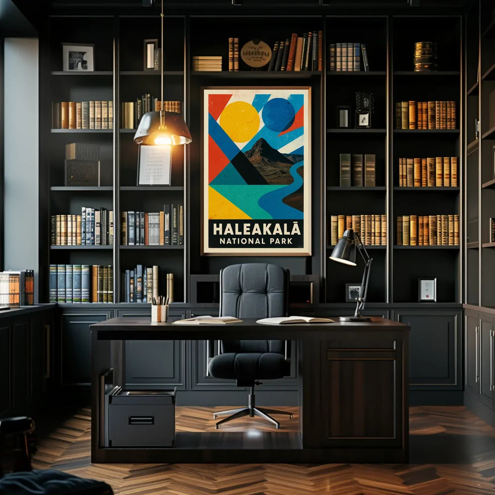 The design employs a vintage travel style with earthy tones and warm hues, reflecting the park's stunning sunrises and lush scenery. It serves as a timeless reminder of Haleakalā's awe-inspiring splendor and ecological significance.