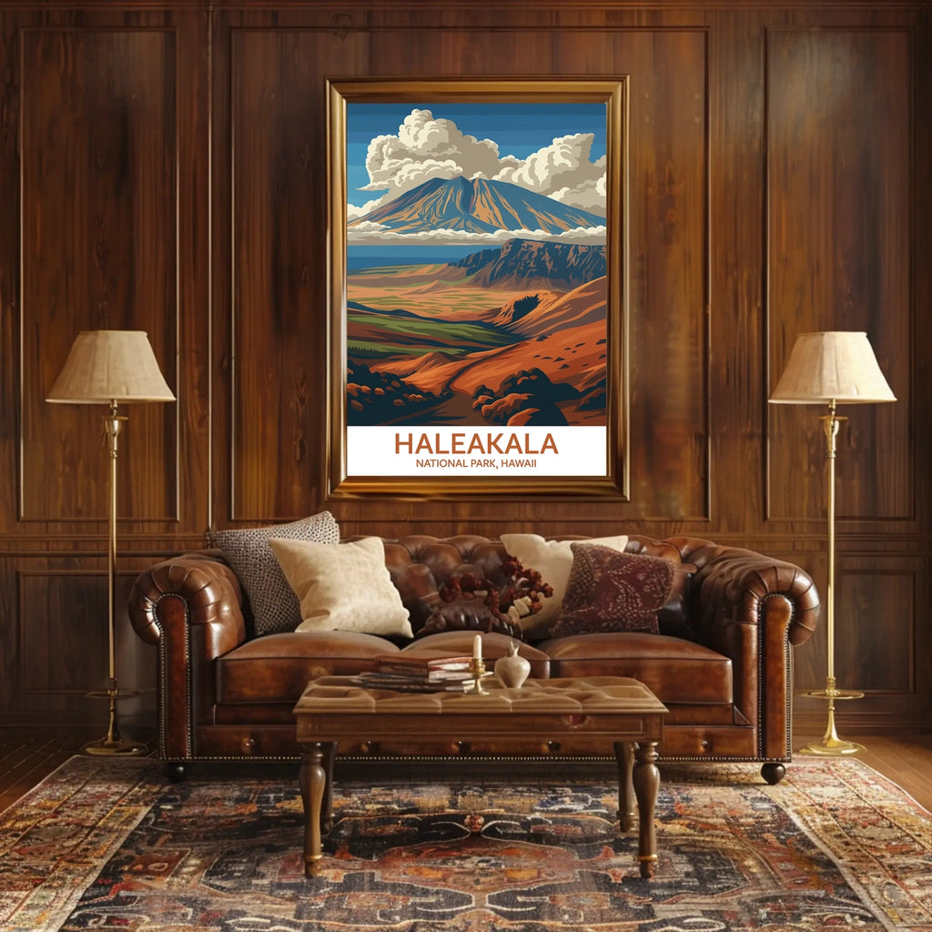 Experience the awe-inspiring allure of Haleakalā National Park with this vibrant poster. The artwork captures the park’s dramatic volcanic landscape, where jagged peaks rise over expansive valleys and a sky alive with dynamic clouds, finished in warm earth tones that brighten any space and spark wanderlust.
