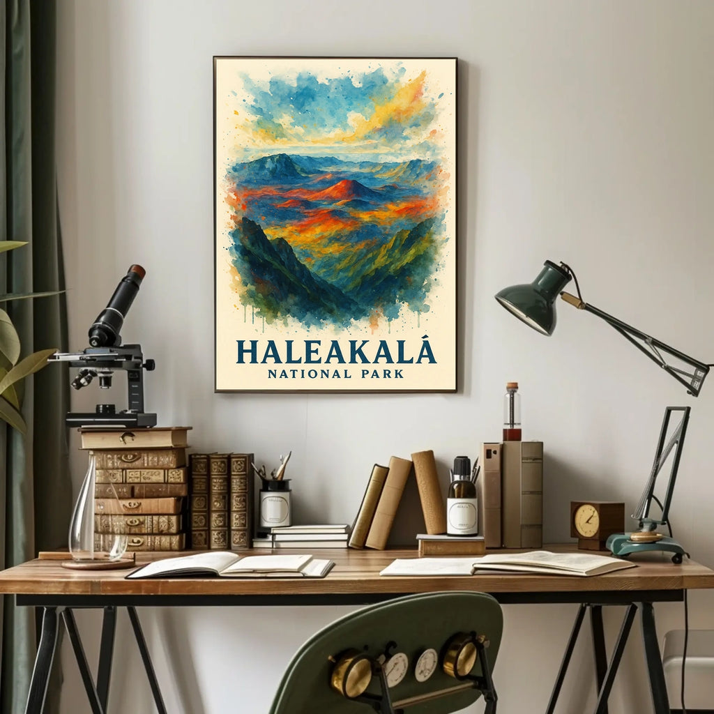 Immerse yourself in the breathtaking beauty of Haleakalā National Park with this vibrant landscape poster. The artwork captures the park's dramatic mountain peaks and valleys, rendered in a striking watercolor style that bursts with dynamic color.