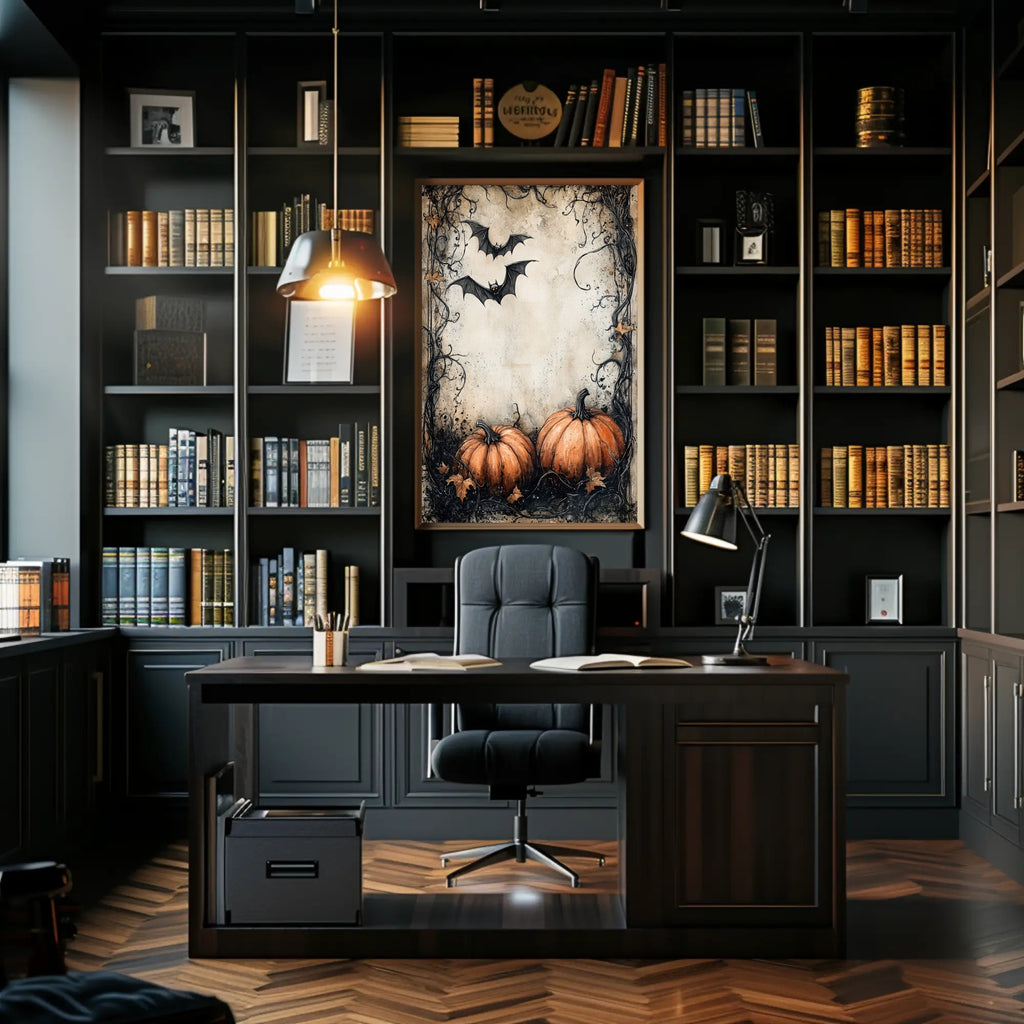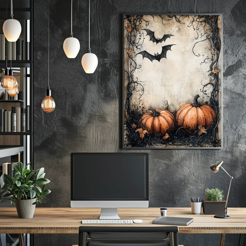 Bring autumn's mystique into your home with the Halloween Harvest Poster from PosterGoat — a striking art print that marries rustic harvest charm with a whimsical, slightly eerie pop-art aesthetic. Richly textured background, curling vine borders, two plump pumpkins and silhouetted bats create a scene that feels both scenic and storybook-ready, perfect for seasonal décor or year-round moody accents.