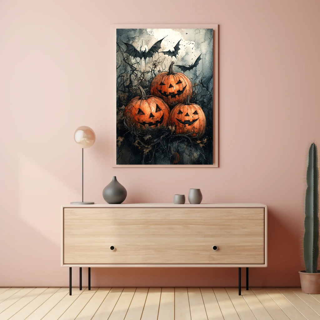 Bring spooky-season style to any wall with the "Halloween Night Jack-O-Lanterns And Poster" from PosterGoat — a dramatic pop-art poster that blends moody scenic tones, grinning jack-o'-lanterns, and swooping bats into a hauntingly beautiful print.