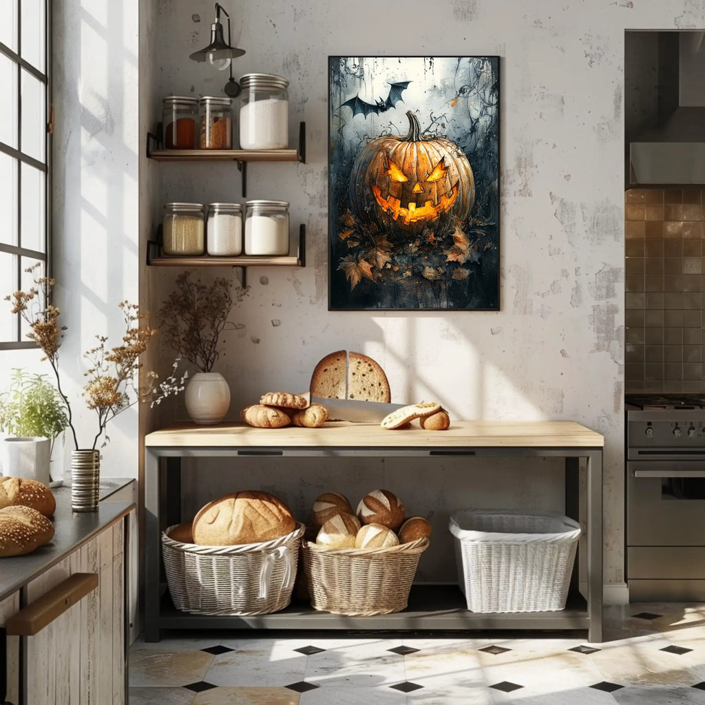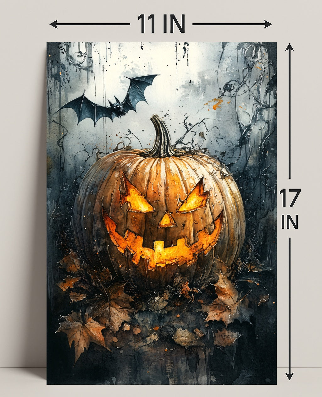 Bring the eerie glow of autumn nights into your home with the Halloween Night Poster from PosterGoat — a striking, minimalist artwork that captures a carved jack-o'-lantern lit from within, a hovering bat, and a moody, textured nightscape perfect for seasonal or year-round wall art.