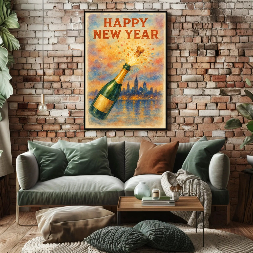 This vibrant watercolor poster captures the exuberance and optimism of a New Year's celebration, with a champagne bottle popping open amidst a sea of colorful confetti. The lively artwork features a city skyline reminiscent of New York, beautifully reflected on a serene body of water, with striking urban reflections rendered in a watercolor skyline. Radiant hues of orange, blue, and purple blend harmoniously to create a festive and dynamic atmosphere that exudes joy and hope. Perfect for ringing in the New Year, this poster encapsulates the spirit of celebration and the anticipation of new beginnings.