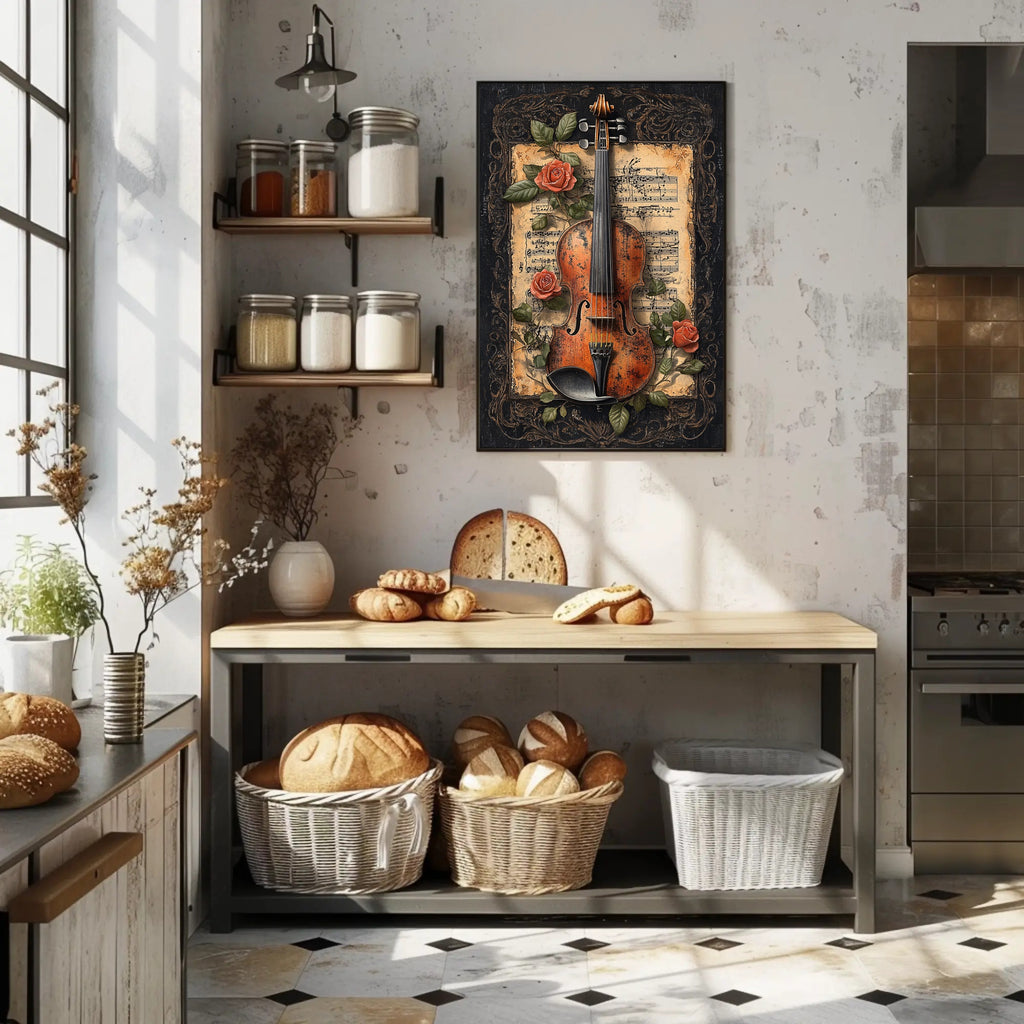 Museum-quality print: Crisp, high-resolution imagery captures the textured woodgrain of the violin, aged parchment of the score, and lifelike rose petals for gallery-caliber display.