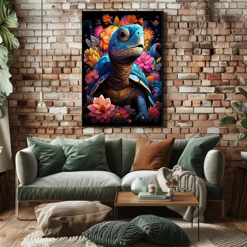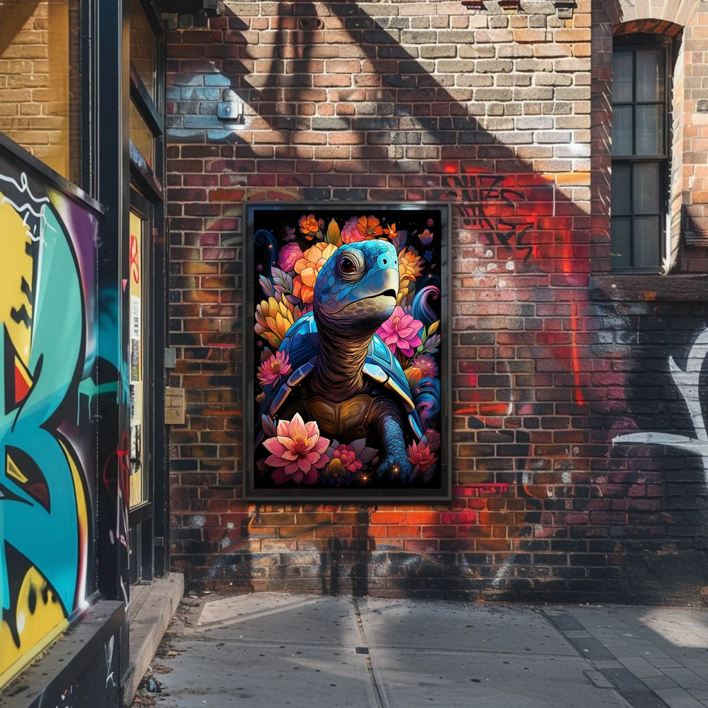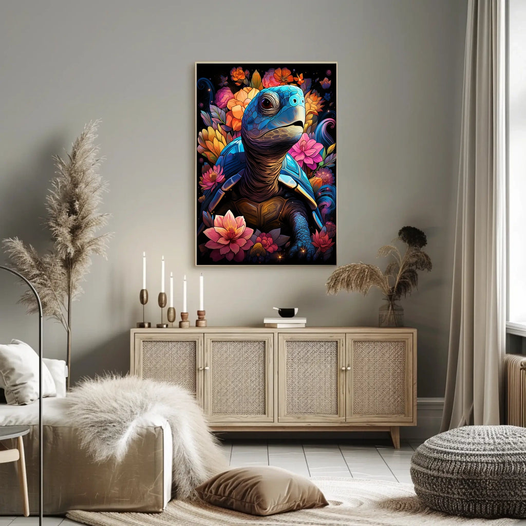 Immerse yourself in the serene beauty of Harmony in Bloom, a captivating illustration that showcases a graceful turtle amidst a burst of colorful flowers. This tranquil artwork blends nature and wildlife into a calming scene that elevates any space and invites quiet reflection.