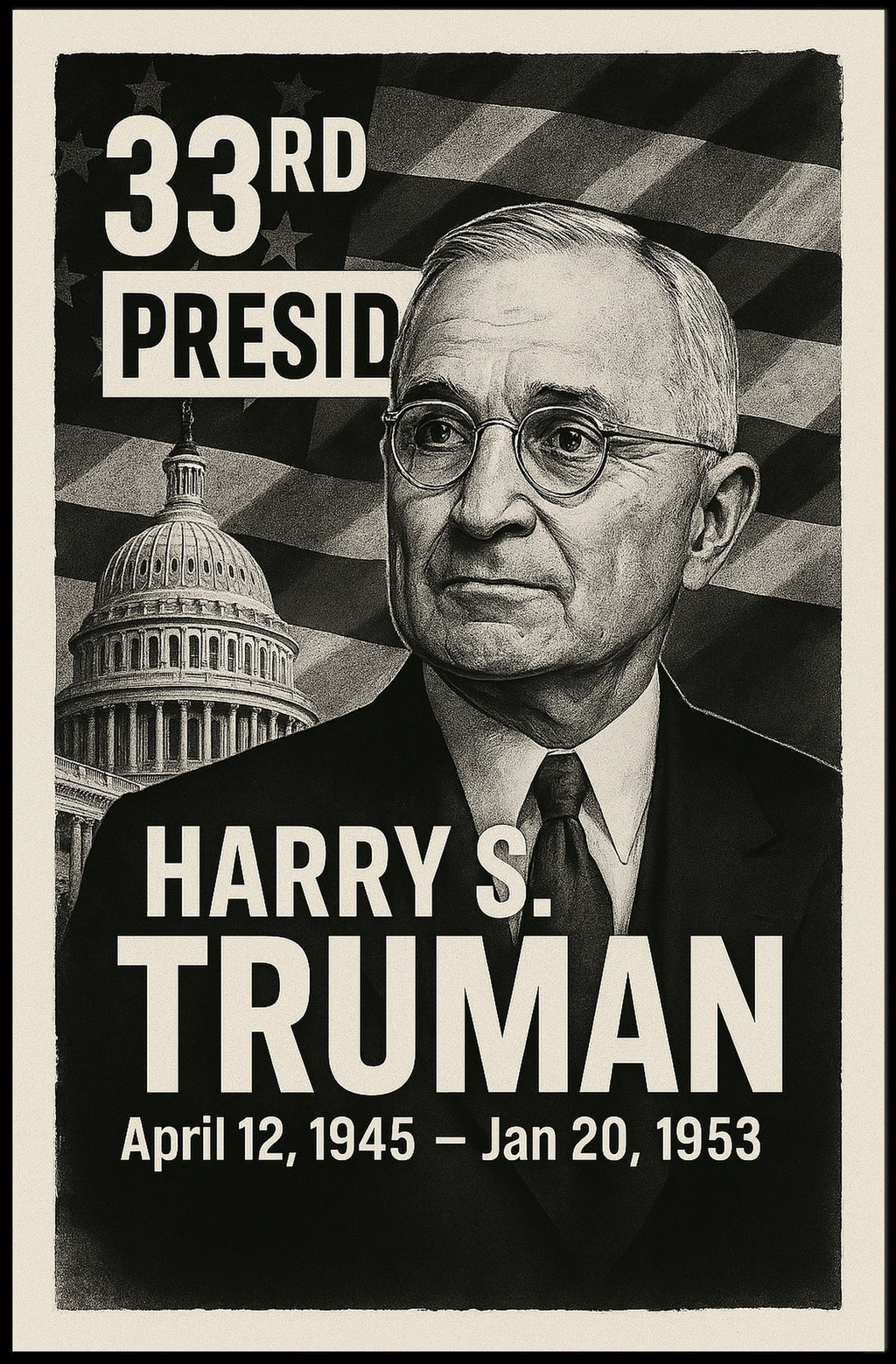 - Printed with precision and made to inspire, this artwork is more than decoration—it’s a conversation piece that connects history, culture, and style. Bring Harry S. Truman 33rd President of the United States Digital Montaje Poster into your home, classroom, or office today and let your walls tell a powerful story.