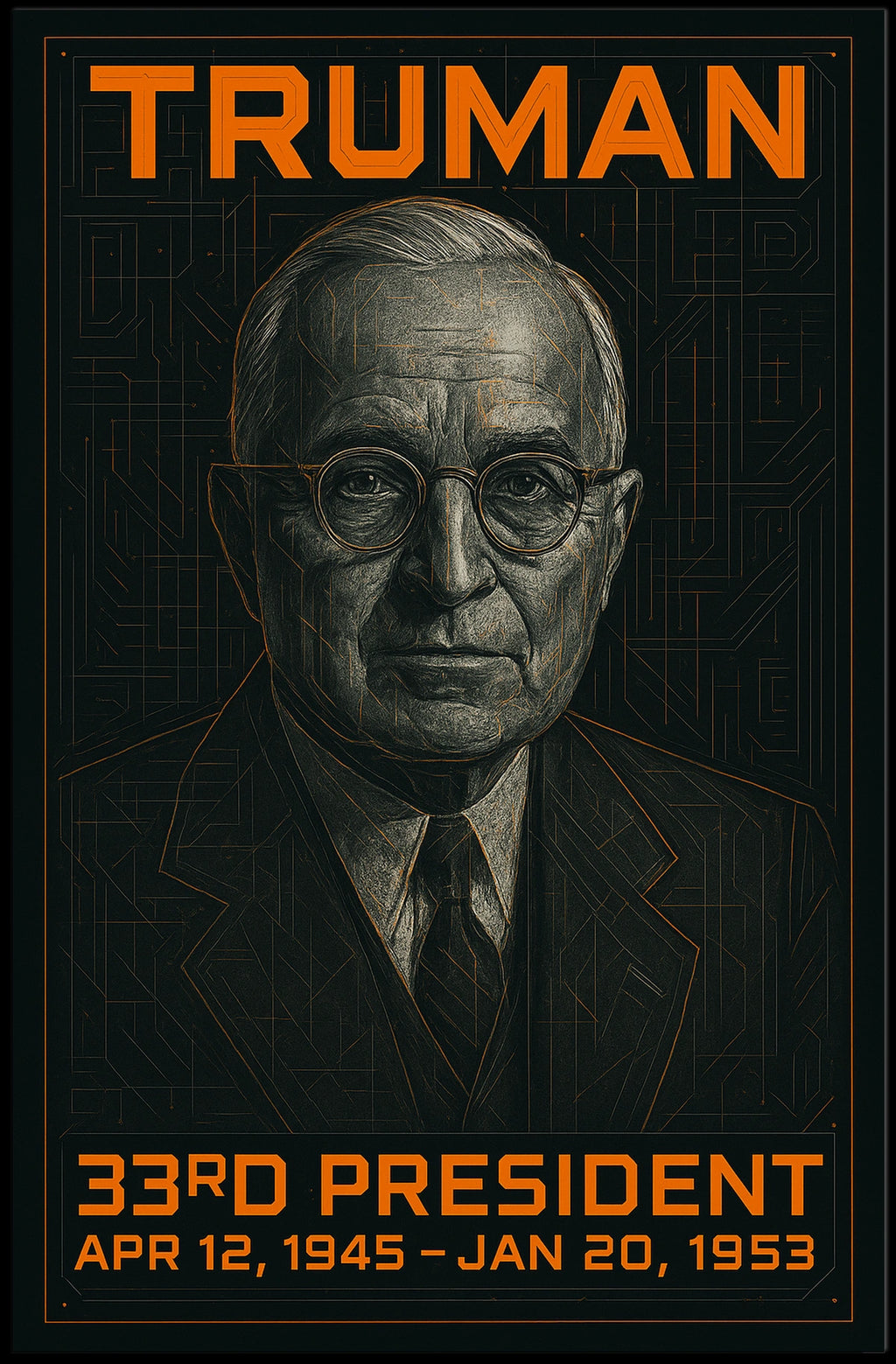 Celebrate the enduring legacy of Harry S. Truman, the 33rd President of the United States, with this Techno Schematic Poster. This timeless wall art captures Truman’s unique appeal, making it perfect for collectors, enthusiasts, or anyone who wants to bring meaning and inspiration into their space. A striking homage to American politics and US history, it blends a vintage portrait vibe with a modern glow-art aesthetic, elevating any room with a touch of USA flair.