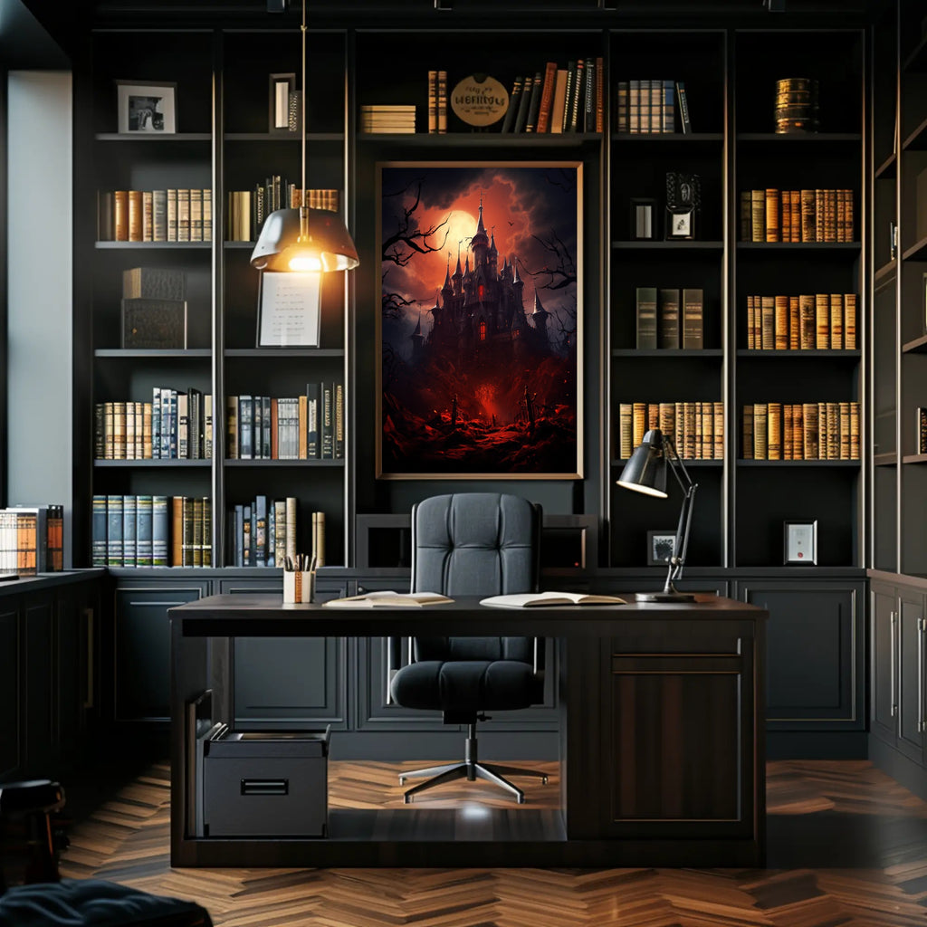 This poster is ideal for decorating a feature wall, completing a themed gallery, or giving as a thoughtful, atmospheric gift to fans of horror, fantasy, and dramatic scenic prints. The intense red glow and intricate silhouettes work beautifully in dimly lit rooms or contrasted against light walls for maximum impact.