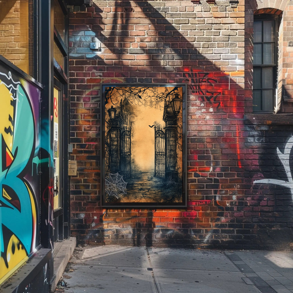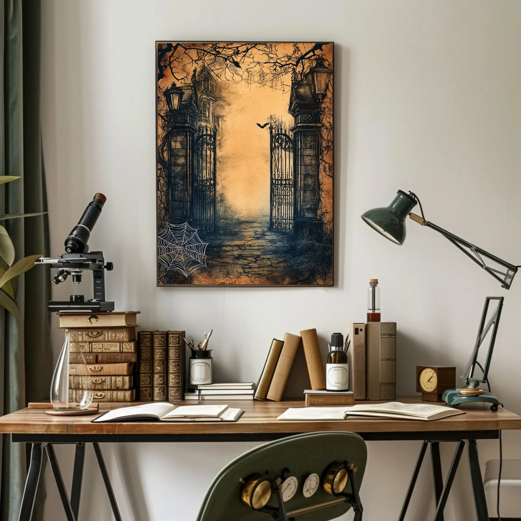Invite a whisper of mystery into your space with the Haunted Gateways Poster from PosterGoat. This 18x24 art print captures a fog-shrouded entrance framed by ornate wrought-iron gates, weathered stone pillars with lanterns, curling vine silhouettes, drifting bats and delicate spiderwebs — all rendered in a timeless, distressed aesthetic that blends Halloween charm with minimalist, scenic decor.