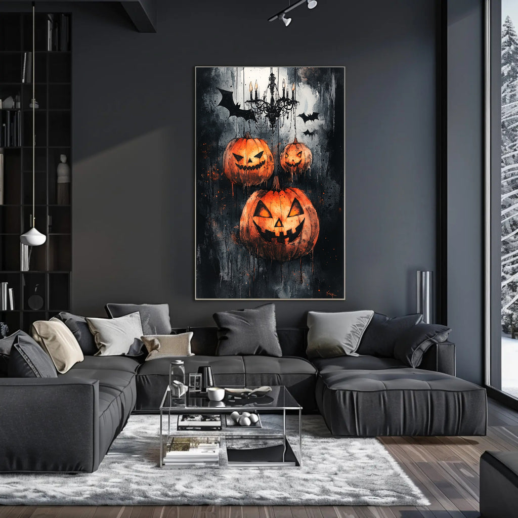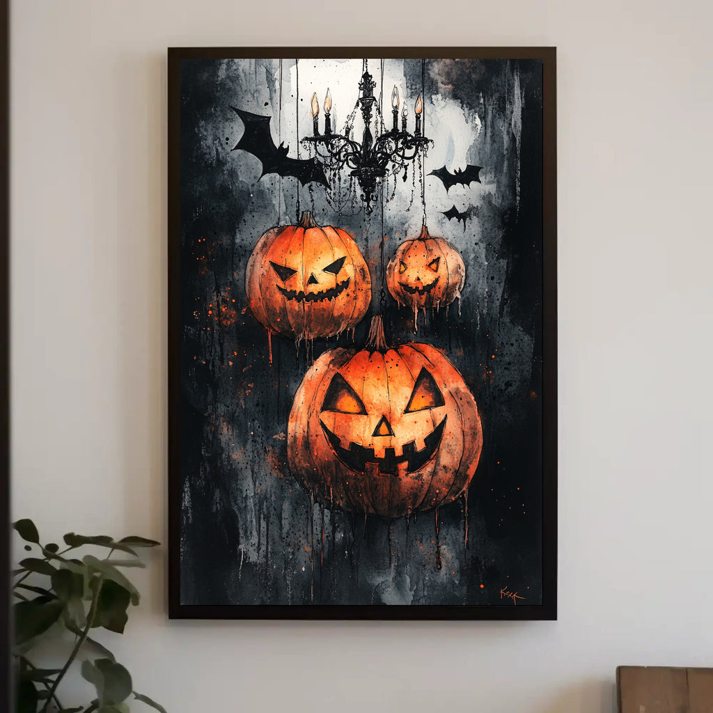Bring spine-tingling style to your walls with the Haunted Halloween Night Poster from PosterGoat — a striking 18x24 art print that blends eerie charm with minimalist, scenic artistry. Moody charcoal washes, dripping orange jack-o'-lanterns, a gothic chandelier and silhouetted bats combine in a dramatic composition that commands attention in any room.