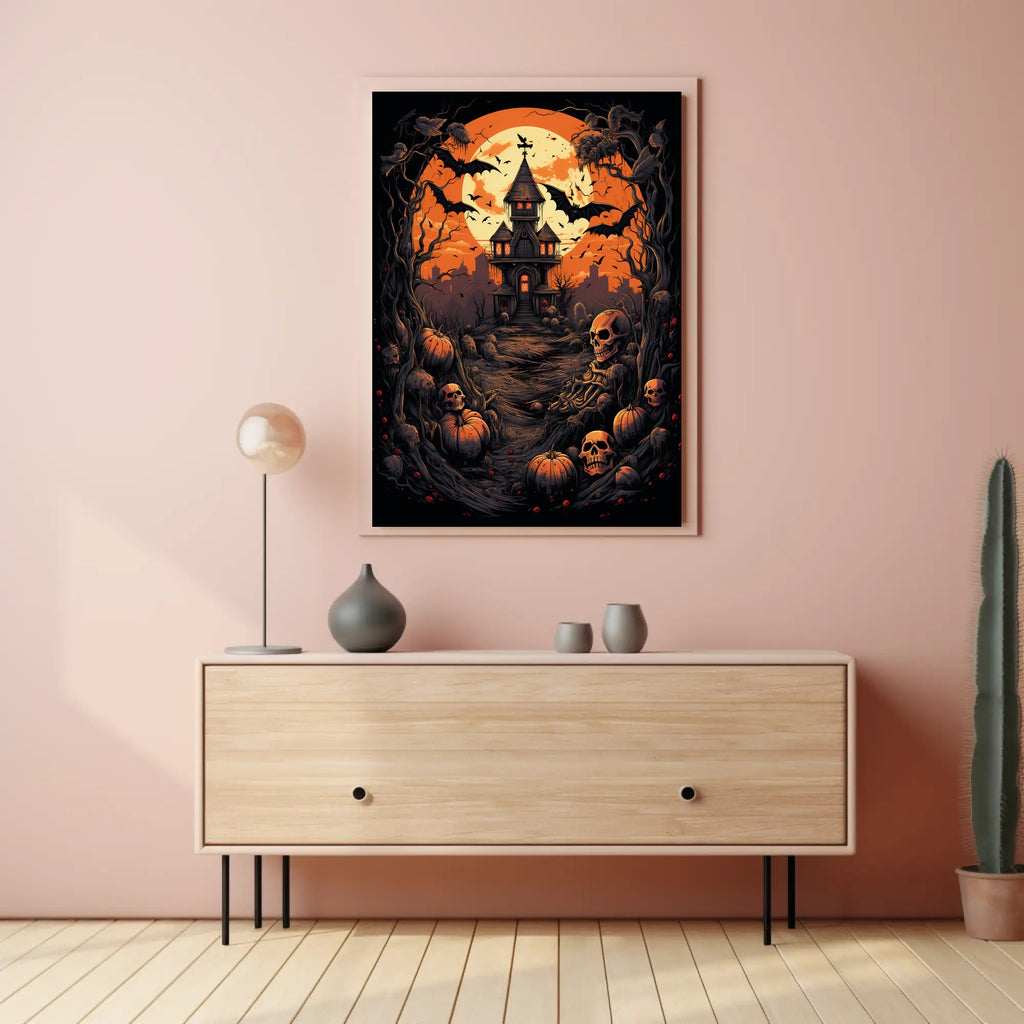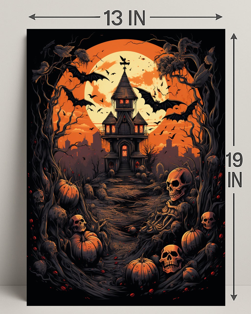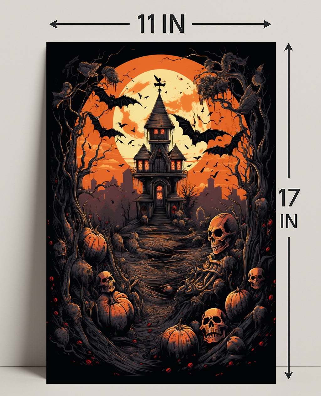 Striking Visuals: Featuring intricate details of a haunted house surrounded by pumpkins and bats, this poster creates a captivating focal point in any room.