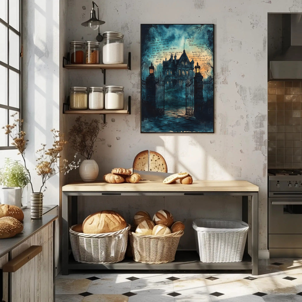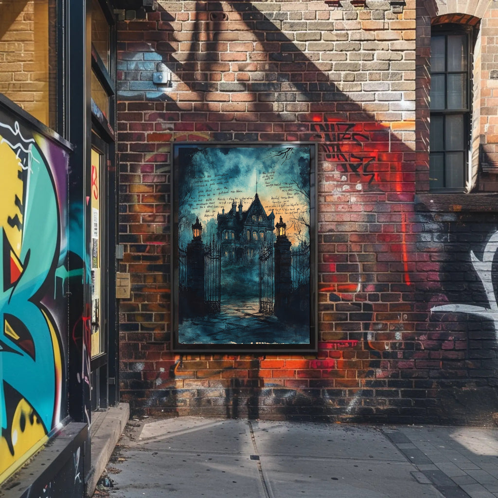 Bring a whisper of mystery to your walls with the Haunted Manor At Dusk Poster from PosterGoat — a moody, pop‑art inspired print that captures a foggy manor beyond wrought‑iron gates, glowing lanterns, and a twilight sky streaked with teal and amber. Perfect for decor lovers, Halloween enthusiasts, and anyone who favors atmospheric, travel‑inspired artwork.
