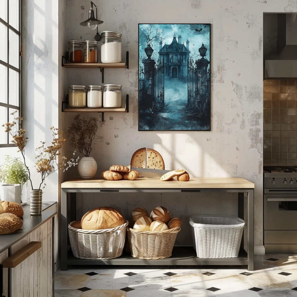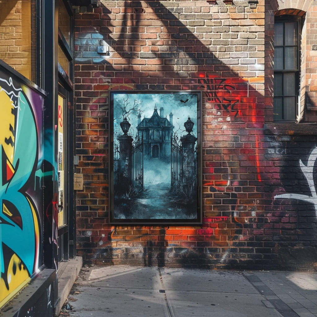 Haunted Manor At Dusk by PosterGoat transforms any wall into a moody, cinematic moment — an eerie Victorian manor looming behind ornate iron gates, lantern-topped pillars, drifting mist and the flutter of silhouetted bats. This atmospheric poster blends minimalist composition with richly textured brushwork to evoke travel-worthy, storybook scenery perfect for seasonal displays or year-round ambiance.