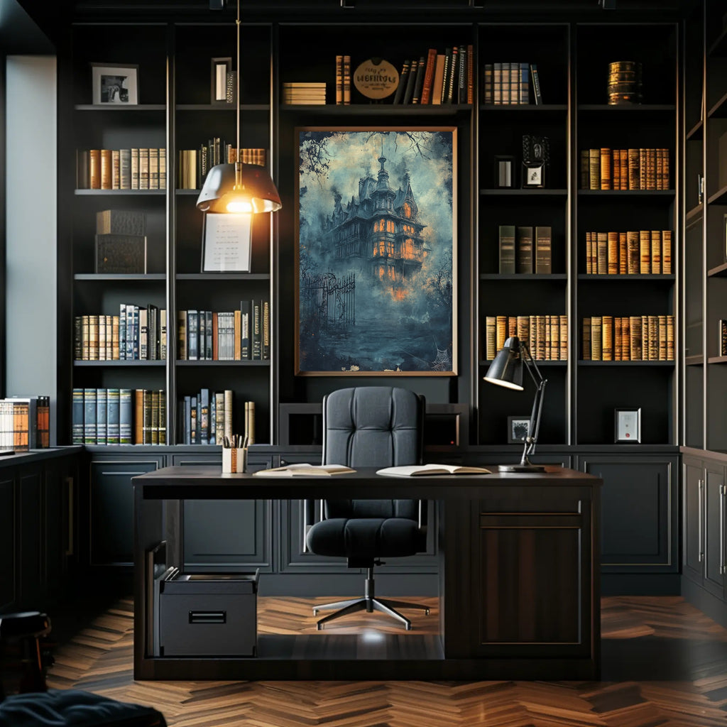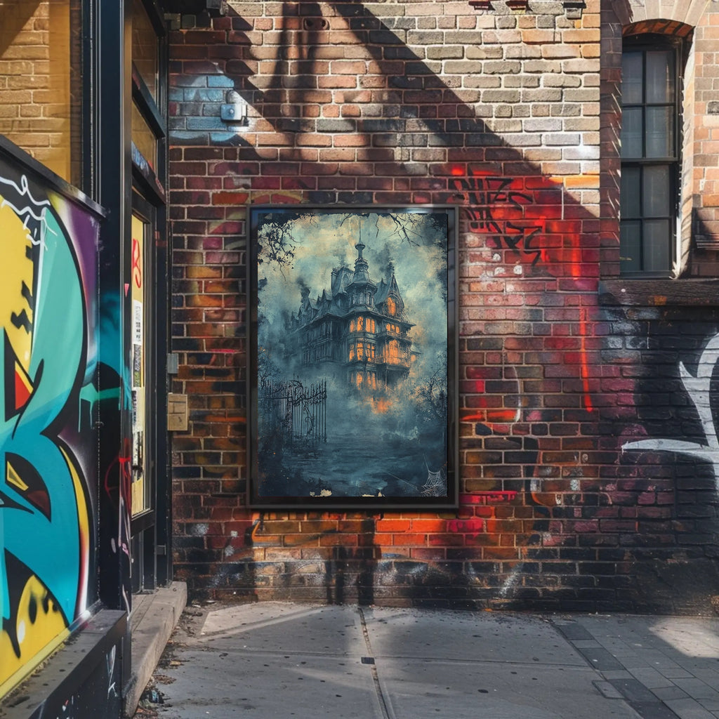 Why choose this poster? The Haunted Mansion In The Mist Poster combines cinematic mood, photorealistic artistry, and high-contrast color grading to create a hauntingly beautiful centerpiece that complements modern, gothic, and eclectic interiors.