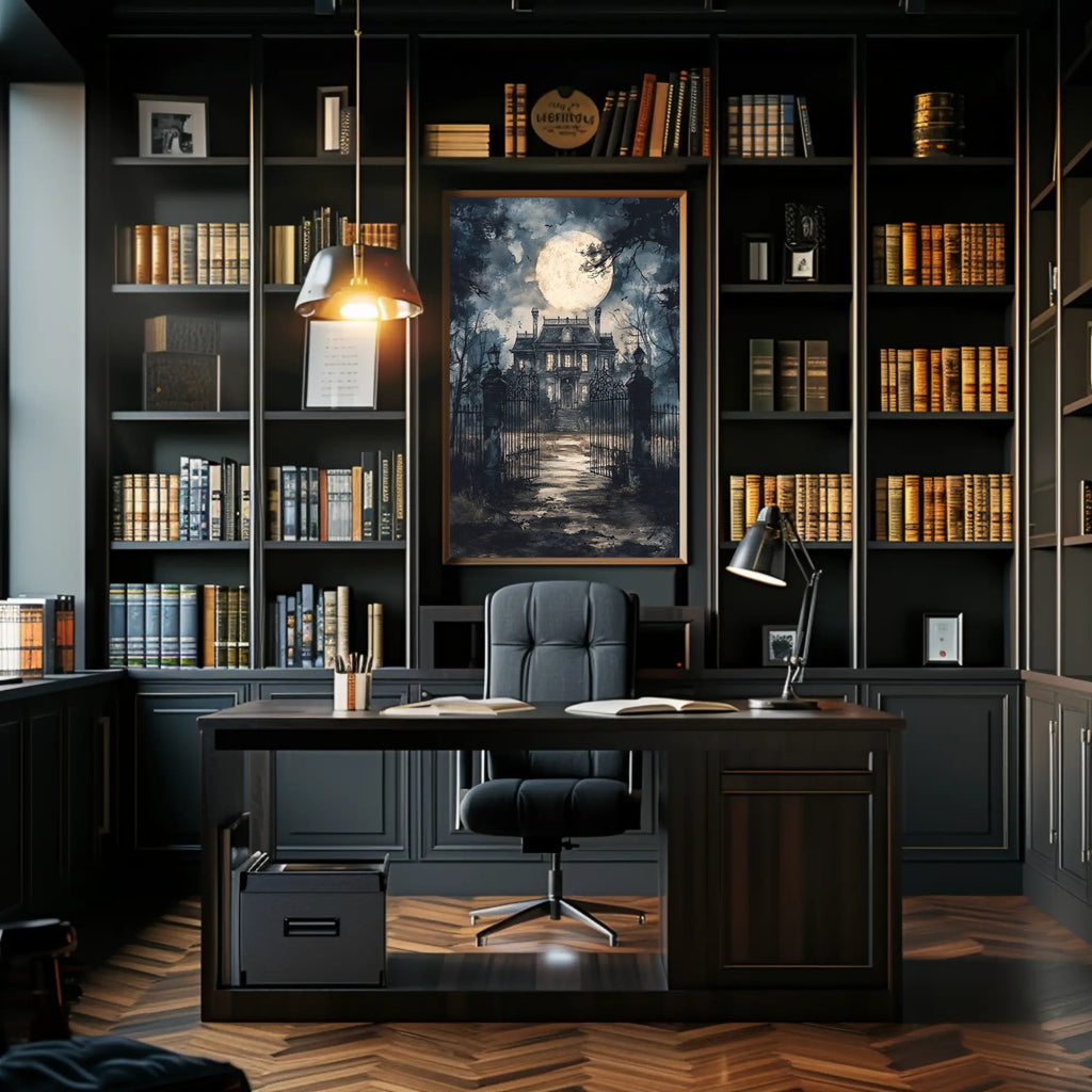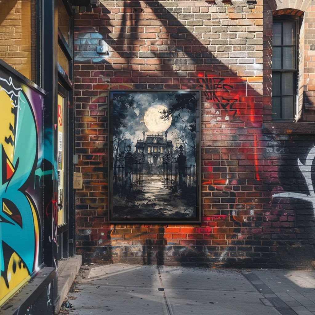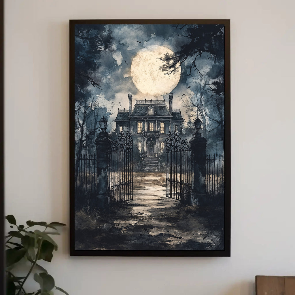 Bring moonlit mystery to your walls with the Haunted Mansion Under The Moon Poster by PosterGoat — a striking art print that blends gothic atmosphere with pop‑art sensibility. This scenic poster depicts a grand, weathered mansion beyond ornate wrought‑iron gates, a luminous full moon rising through stormy clouds, and shadowy bats skimming bare branches — an evocative centerpiece for Halloween displays, themed rooms, or anyone who loves hauntingly beautiful wall art.