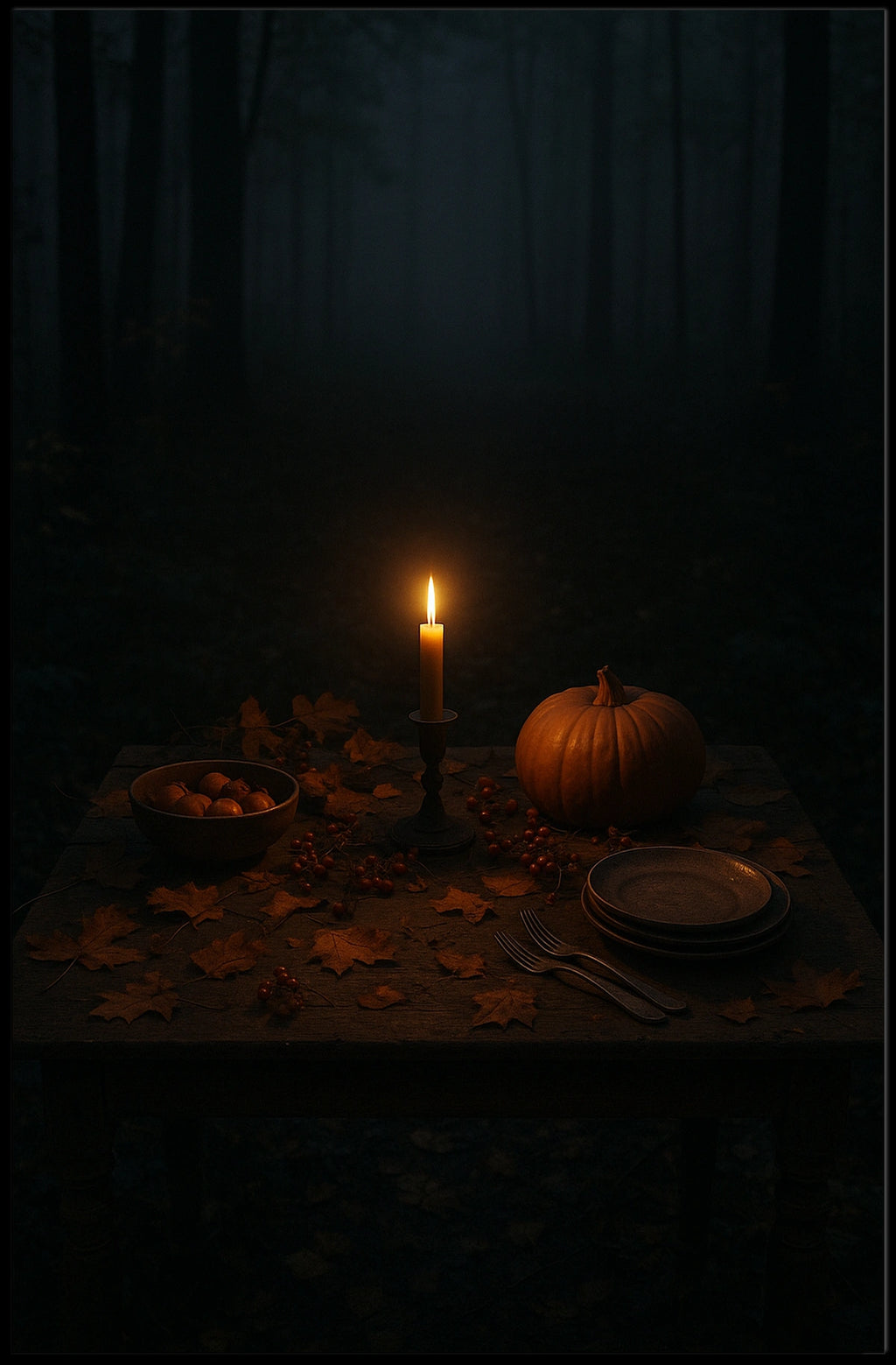 Haunting Autumn Forest Table Scene Artistic Poster invites you to immerse yourself in the atmospheric allure of autumn. This poster showcases a mysterious setting amidst a dark, misty forest, where a wooden table creates an uncanny centerpiece. A single lit candle casts a warm glow over autumn leaves, a pumpkin, small red berries, and a bowl of fruit, evoking the essence of fall festivities. The realistic details of the plates and forks suggest a mysterious meal arrangement, adding to the eerie charm. Perfect for Halloween or any fall-themed decor, this poster's dark, moody artistry captivates with its photorealistic touch and seasonal evocation.