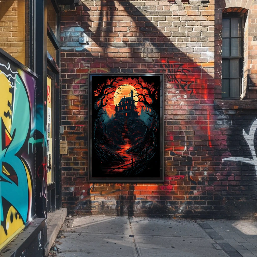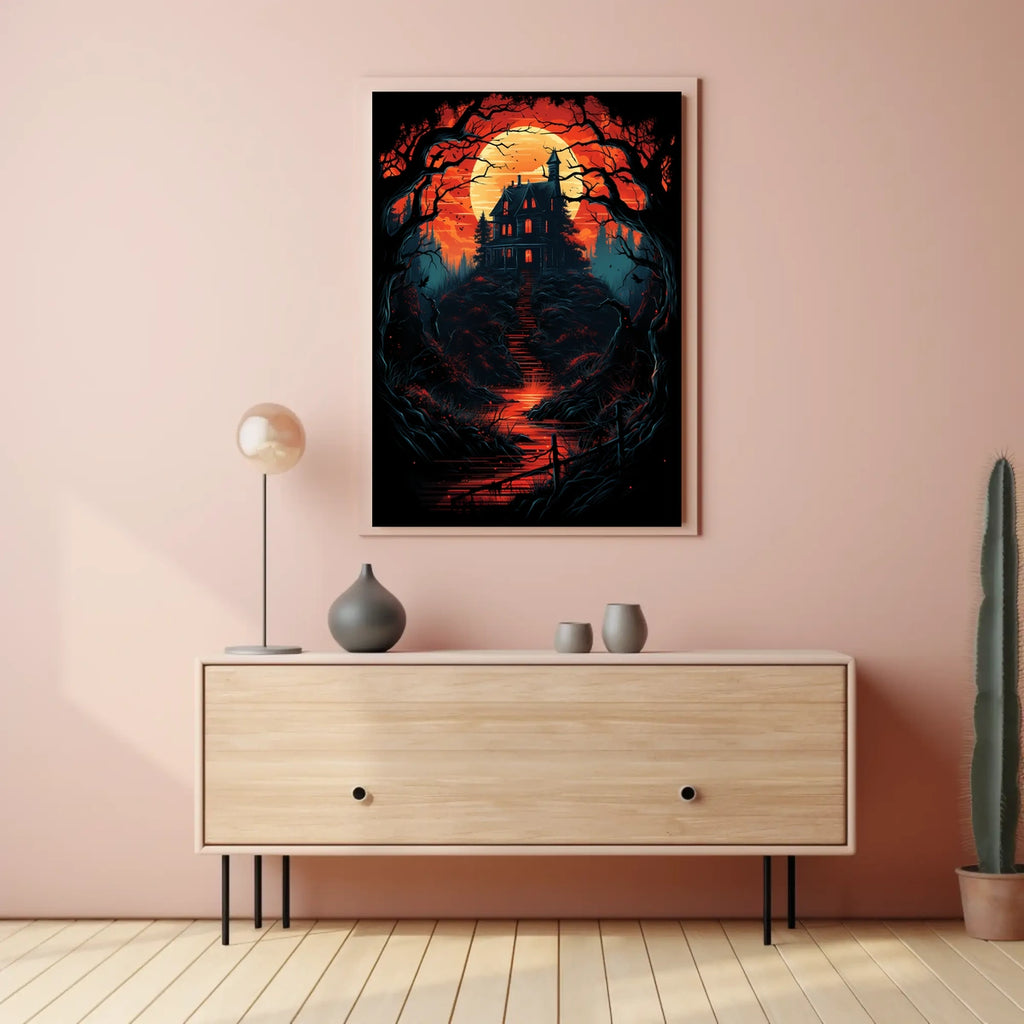 Immerse yourself in a world of mystery with this captivating poster, featuring a gothic mansion silhouetted against a fiery, supernatural sky. Perched atop a hill and surrounded by twisted, barren trees, the scene is haunting and atmospheric. The moon casts an ominous glow, enhancing the chilling ambiance with a palette of intense reds and oranges. A winding path leads to the mansion, inviting you into its shadowy depths. This modern dark fantasy artwork is perfect for those drawn to themes of horror, mystery, and the supernatural, making it an ideal addition to any eerie landscape collection.