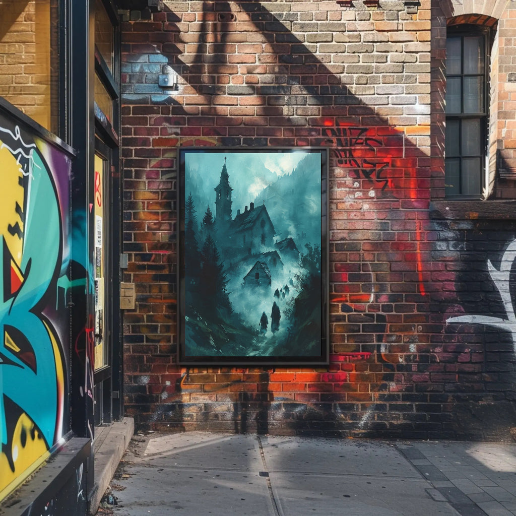 Immerse your space in a spine-chilling, cinematic scene with the Haunting Misty Landscape Gothic Fantasy Art Poster from PosterGoat. This evocative poster captures a deserted medieval village shrouded in swirling cyan mist, where cloaked figures wander a narrow path beneath the silhouette of a ruined church bell tower — a perfect statement piece for fans of dark fantasy, gothic art, and eerie atmosphere wall decor.