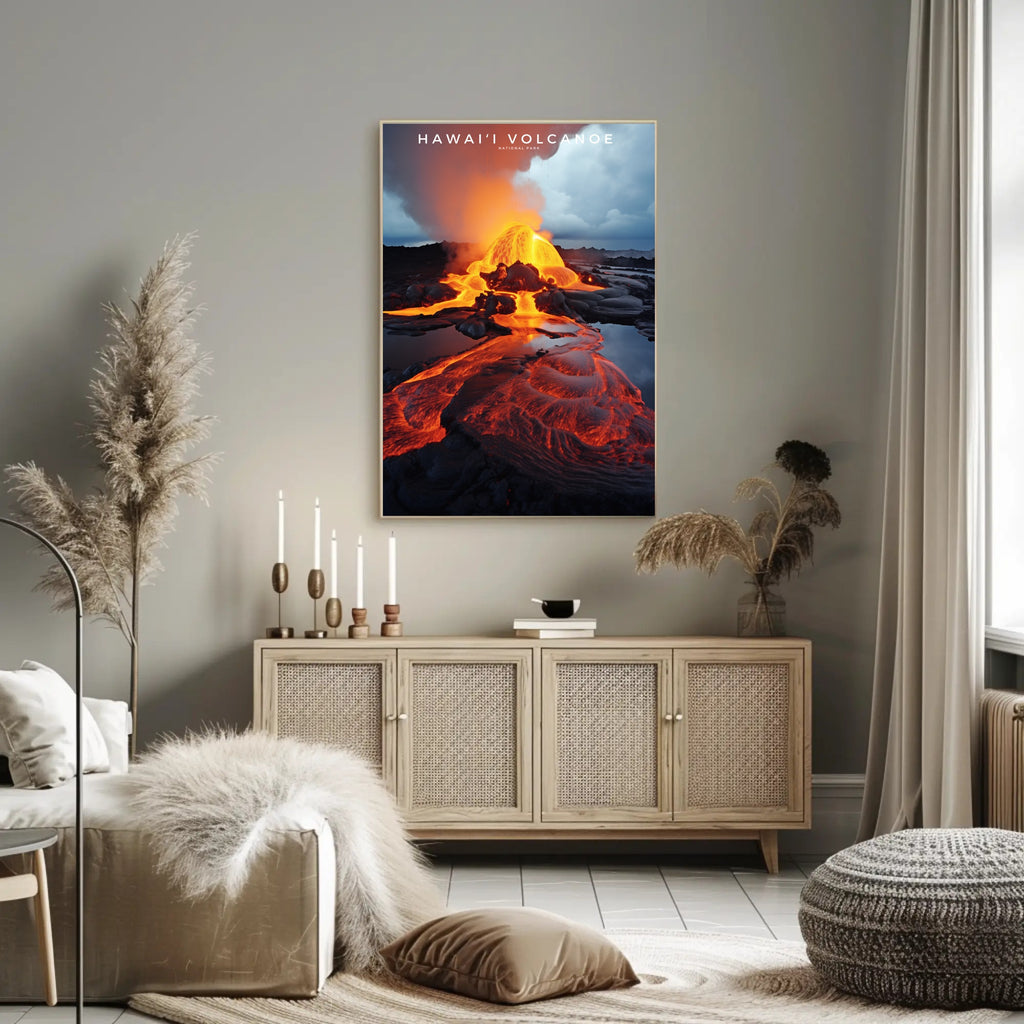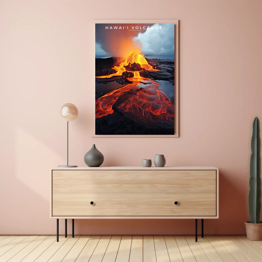 Bring the raw, breathtaking power of Hawaii Volcano National Park into your home with this striking eruption travel poster. Designed for decor lovers and wanderlust spirits, this art print captures dramatic lava flows, smoky silhouettes, and the island's unique volcanic landscape in vivid detail.
