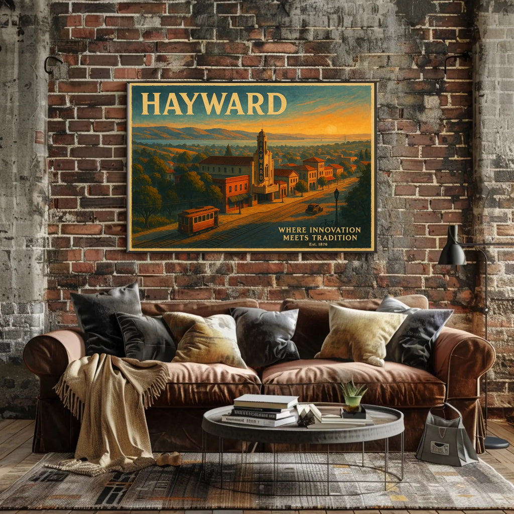 Celebrate the storied charm of Hayward with the "Hayward Travel Poster: Innovation Meets Tradition" from PosterGoat — a vintage-inspired travel poster that blends warm, nostalgic artwork with clean, minimalist design to elevate any room in your home.