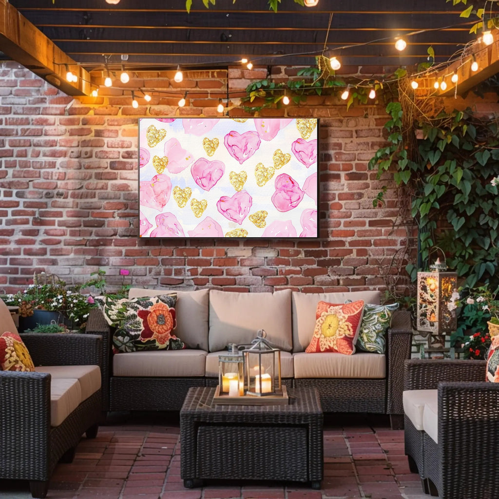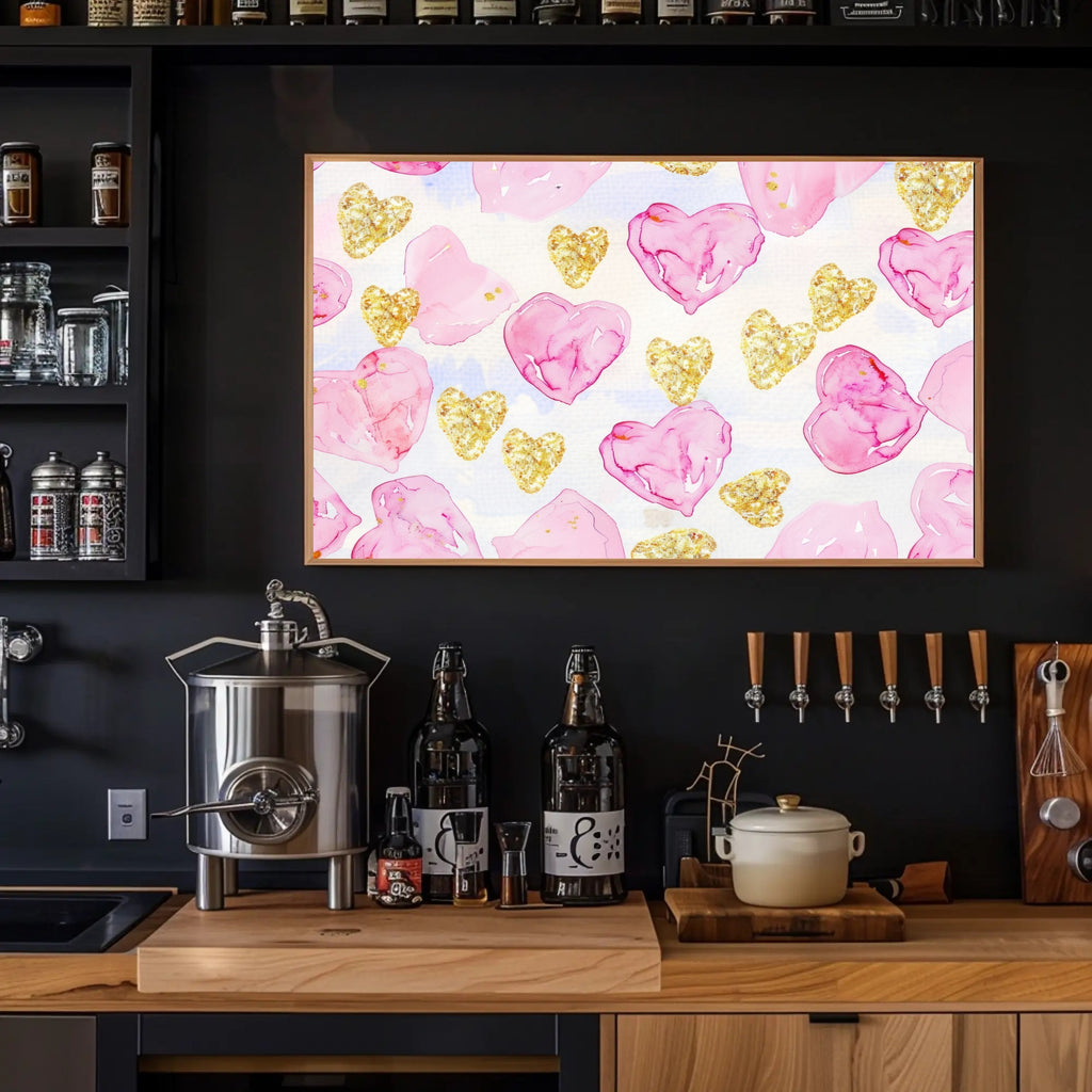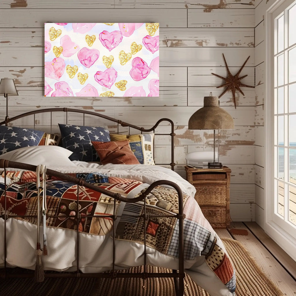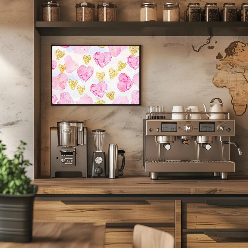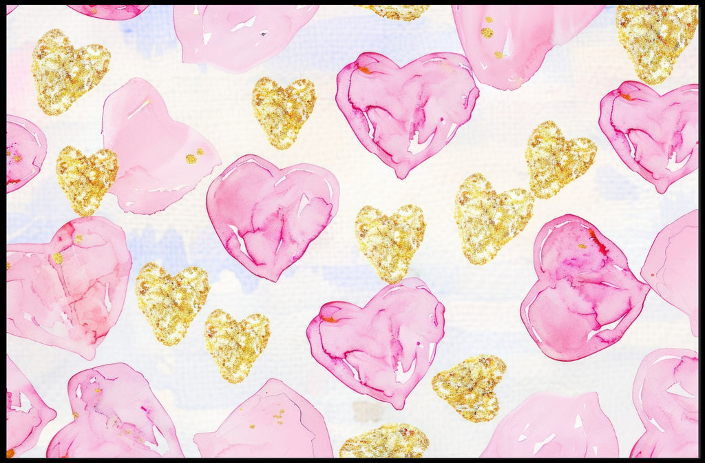 Bring a touch of romantic charm to your walls with the Heartfelt Elegance Poster from PosterGoat. This elegant art print features soft watercolor pink hearts accented by shimmering gold textures, set against a subtle canvas-like background that adds depth and a handcrafted feel. The minimalist composition and vibrant visuals make it a standout piece for living rooms, bedrooms, cafés, or creative workspaces.
