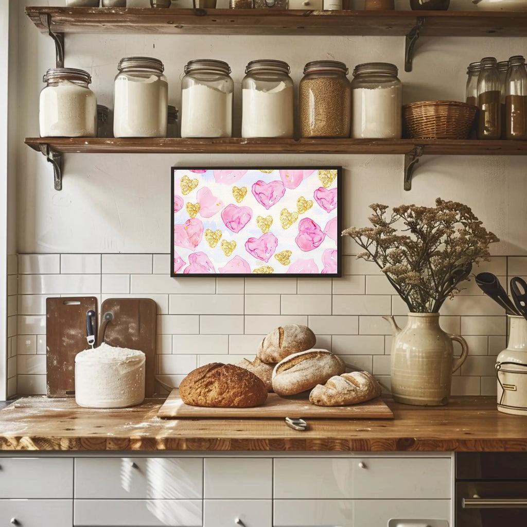 Why you'll love it: the Heartfelt Elegance Poster creates an immediate focal point with its playful yet sophisticated heart motif, adding warmth and personality without overwhelming existing décor. Its soft palette and gold detailing pair beautifully with neutral furnishings or mixed-texture interiors, as shown in curated room scenes.