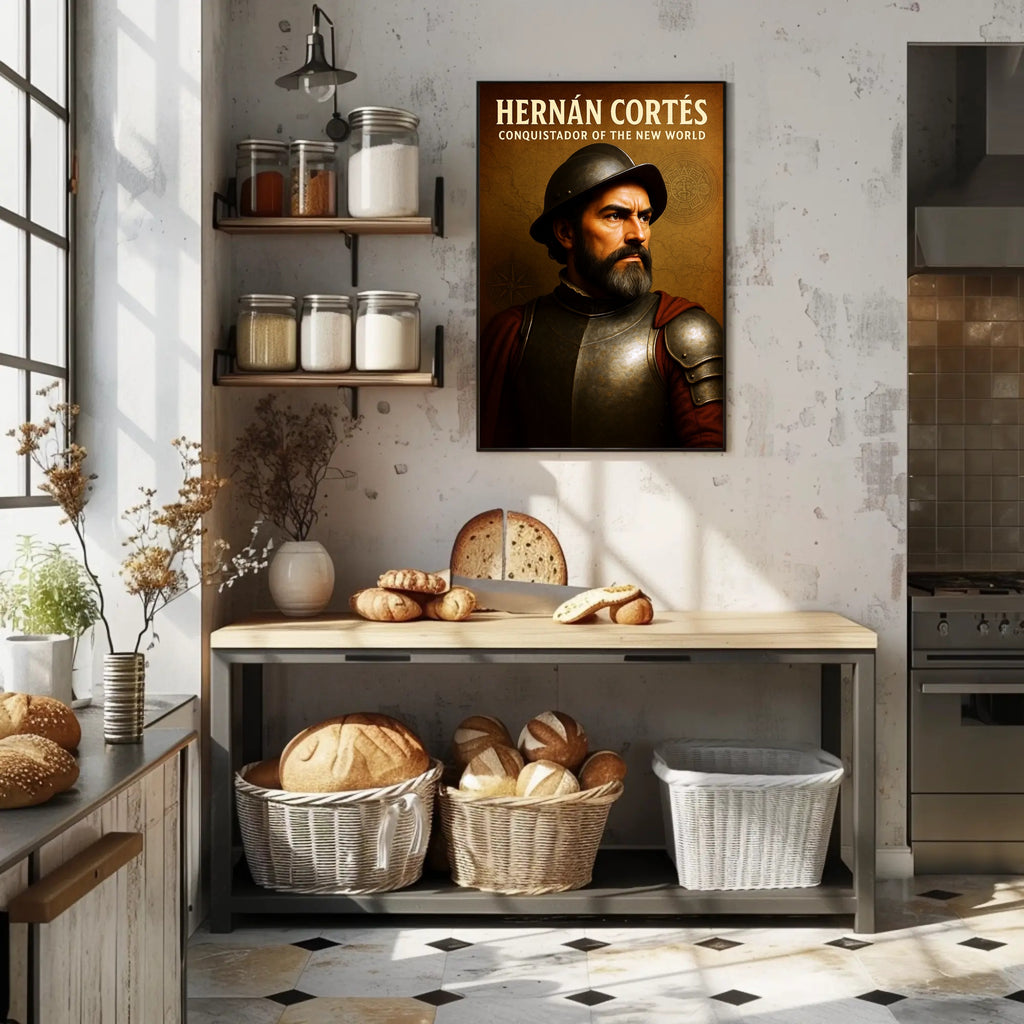 Capture a bold piece of history for your home with the Hernán Cortés — Conquistador of the New World poster from PosterGoat. This striking 18x24 art print blends Pop Art sensibility with classical portraiture: a commanding close-up of Cortés in gleaming armor and a steel helmet, set against a warm, textured backdrop that hints at old maps, compass roses and Aztec-inspired motifs.