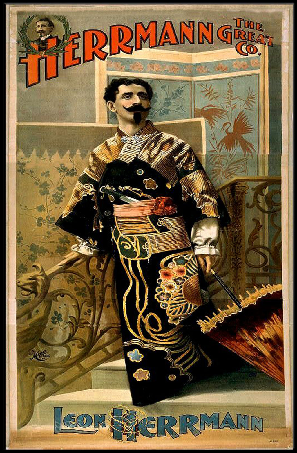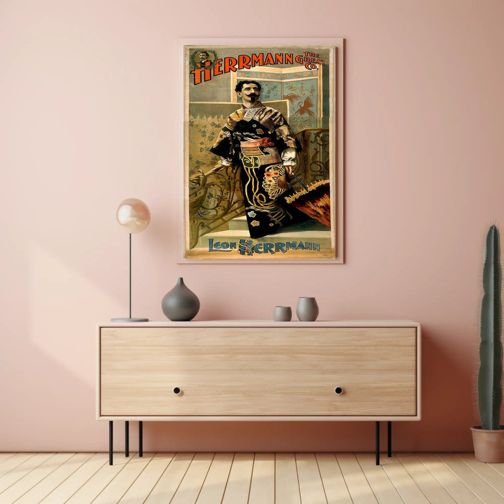 Herrmann the Great returns to the spotlight with this authentic-feeling vintage poster from PosterGoat — a richly detailed reproduction that captures the drama and charm of classic magic-show advertising. The composition features a mustachioed magician in an ornate, embroidered kimono, poised on a carved stair with a tasseled parasol at his side and bold, period typography that announces "Herrmann the Great" in striking orange and blue. This piece makes a striking focal point for any wall and transports viewers back to the golden age of theatrical poster art.