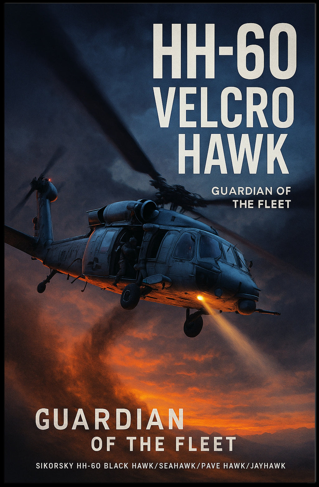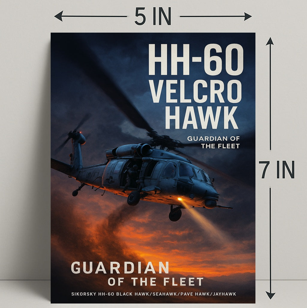 Bring cinematic aviation drama to your walls with the HH-60 Velcro Hawk Poster from PosterGoat — a stunning, minimalist poster print that celebrates the Sikorsky HH-60 family as the true "Guardian of the Fleet." This art-forward poster pairs a striking dusk-time composition of a hovering HH-60 with bold, modern typography to create a powerful focal point for living rooms, home offices, hangars, or collector galleries.