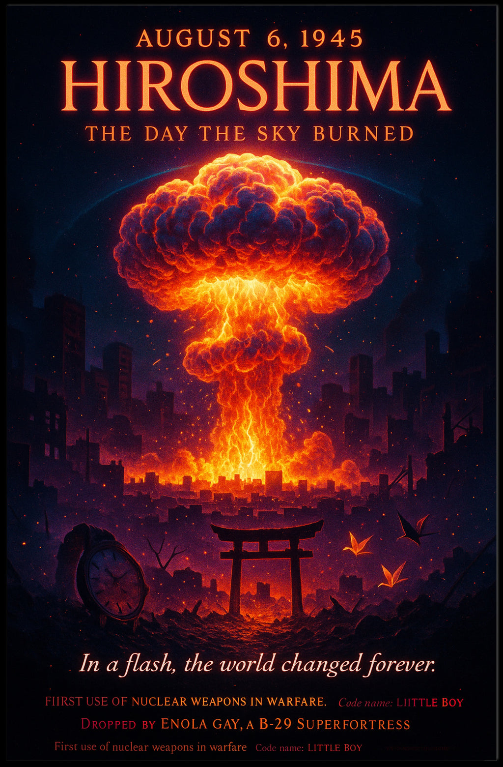 Hiroshima – The Day the Sky Burned Poster from PosterGoat is a striking piece of historical artwork designed for collectors, history enthusiasts, and modern home decor lovers. This 18x24 poster captures the haunting moment of August 6, 1945 with cinematic detail: a vivid mushroom cloud ignites the skyline in molten oranges and reds against a deep, star-speckled night, while a silhouetted torii gate, a broken clock and floating paper cranes create a powerful, minimalist composition that speaks to memory, loss, and change.