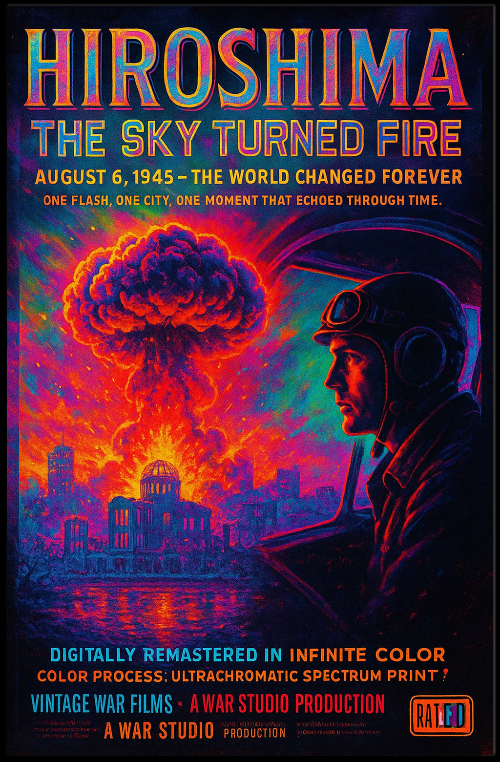 Hiroshima: The Sky Turned Fire Poster by PosterGoat is a striking, minimalist art print that captures a pivotal moment in history with ultrachromatic intensity. Vivid neon hues and deep contrast bring a dramatic mushroom cloud, the iconic A‑Bomb dome silhouette and a contemplative pilot in profile to life—making this poster a powerful conversation piece for any wall in your Home & Garden decor collection.