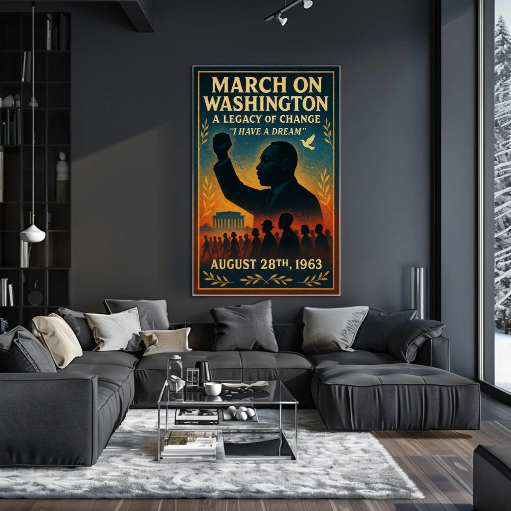 Capture a pivotal moment in American history with the March on Washington commemorative poster art. This striking poster honors the historic August 28, 1963 march, blending vintage-inspired design with a bold, iconic silhouette of a fist raised in empowerment. A timeless addition to Home & Garden decor posters, it invites reflection on unity, courage, and the progress that defined the civil rights movement.
