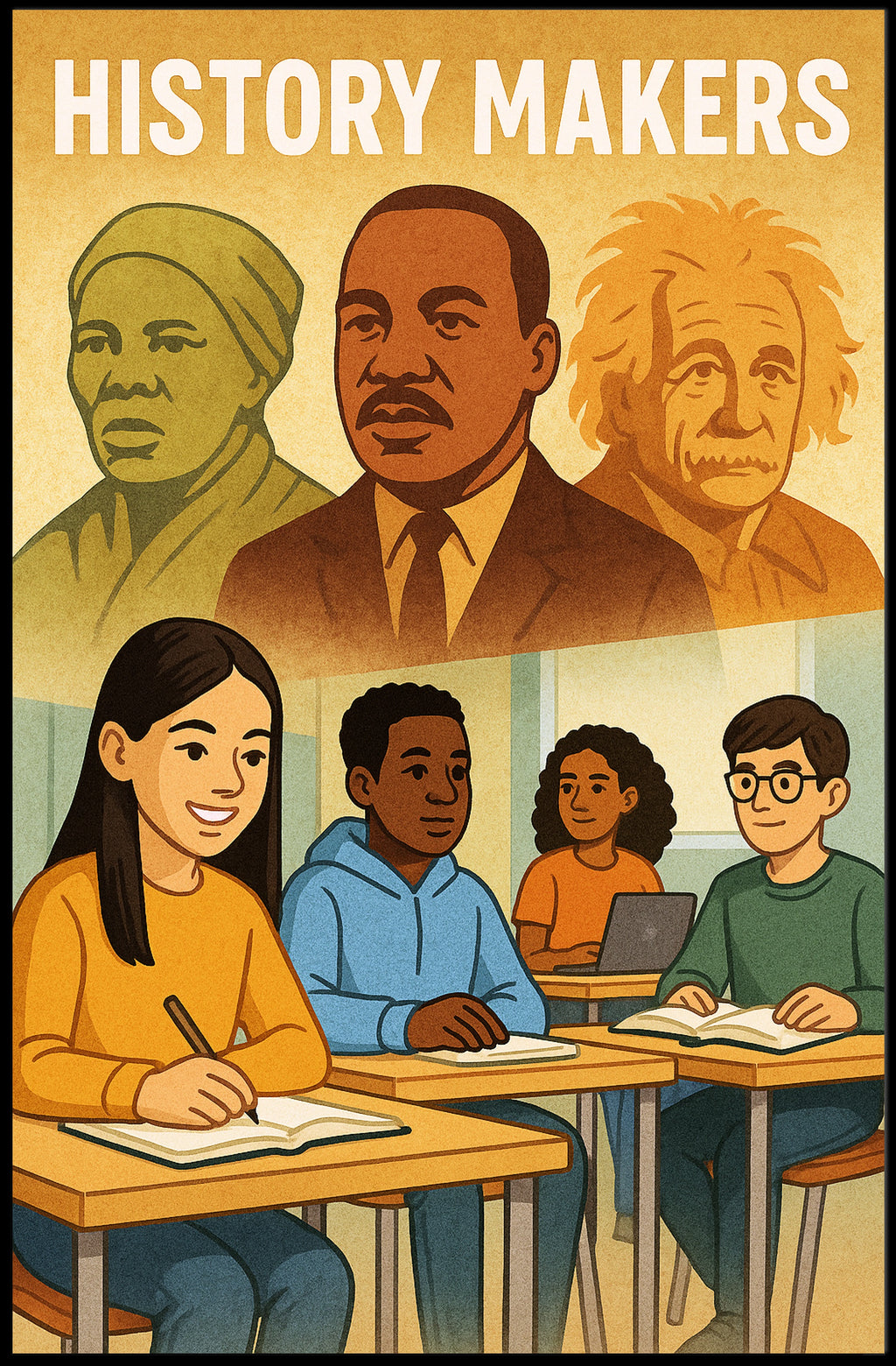 Striking visual story: The design layers iconic historical portraits above a classroom scene of engaged students — a composition that sparks curiosity and motivates discovery.