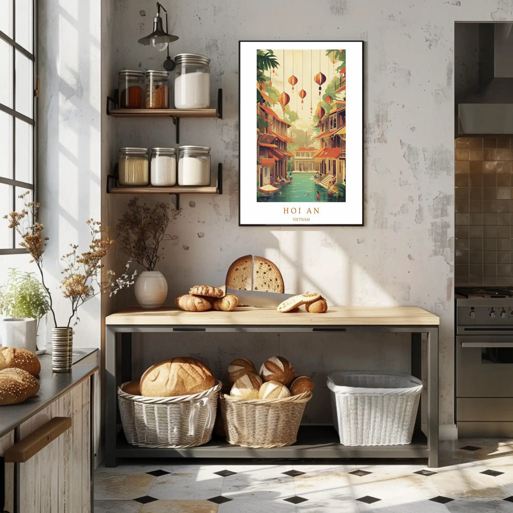 Bring the tranquil charm of Vietnam's riverside streets into your home with the Hoi An Serenity Poster by PosterGoat. This minimalist travel-inspired art print captures a sunlit canal lined with lanterns, traditional shopfronts, and gentle activity — an evocative landscape poster designed for wanderlust souls and interior design lovers alike.