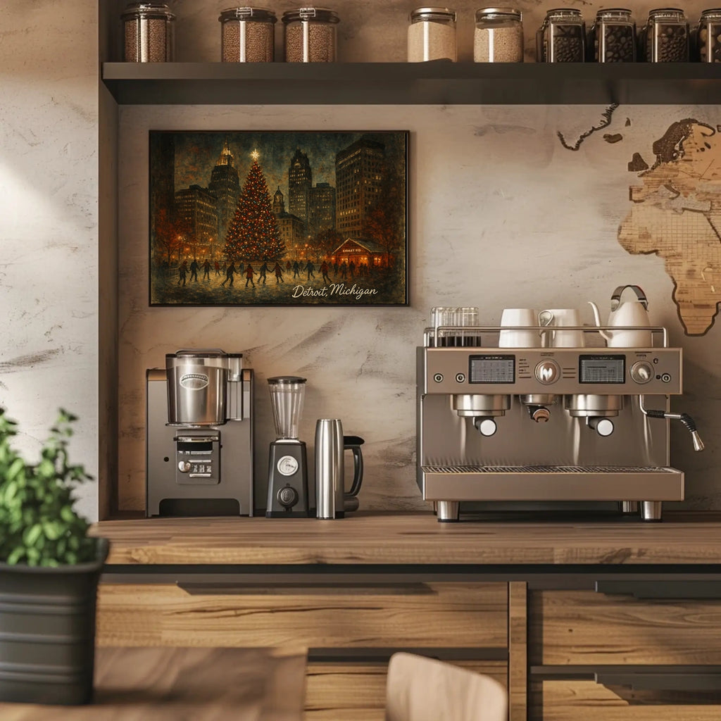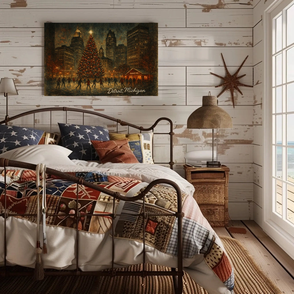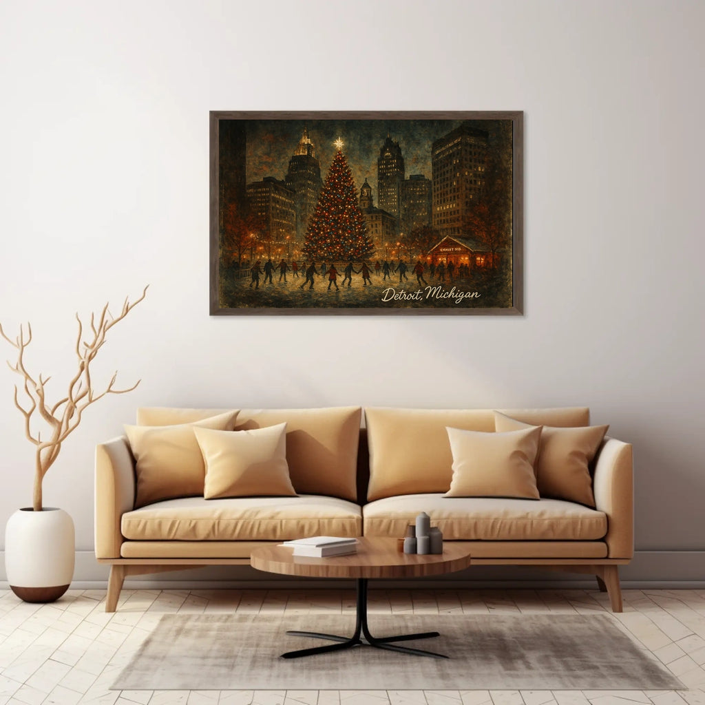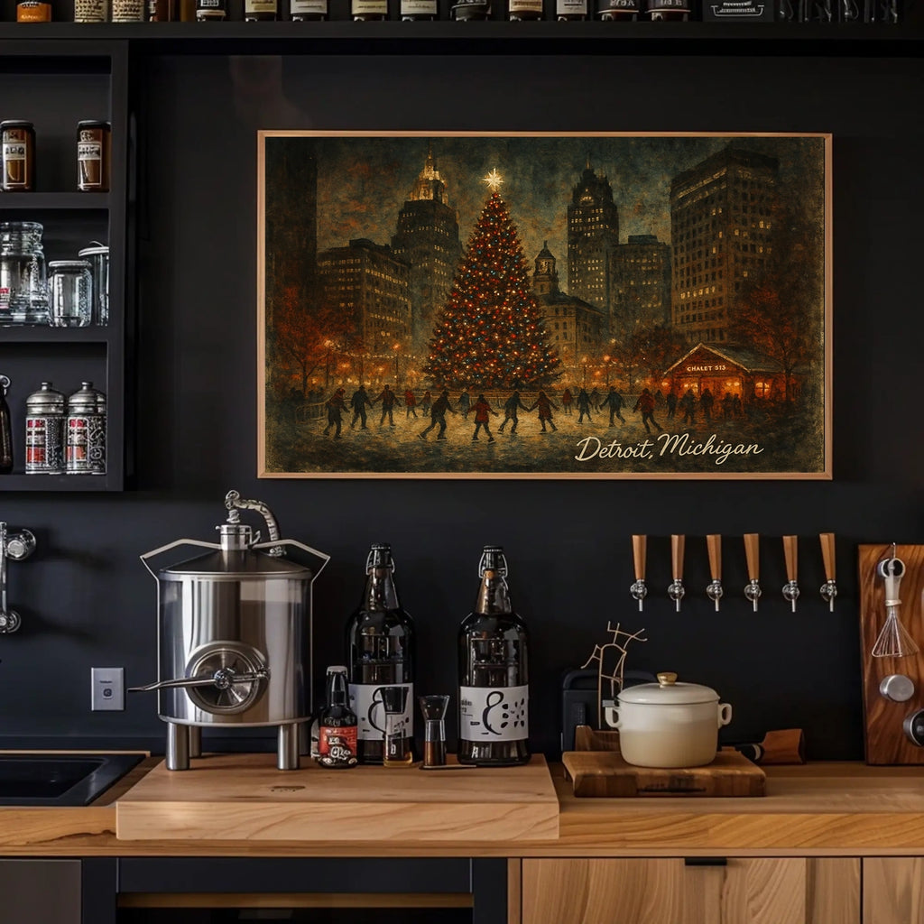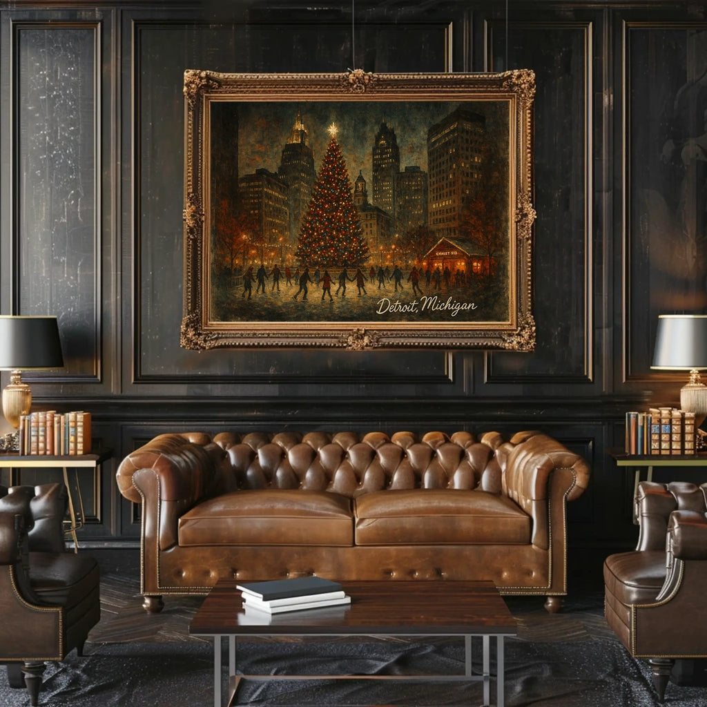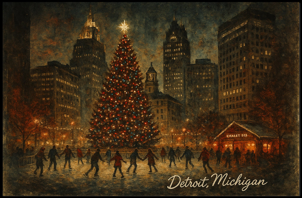 - Detailed design highlighting the festive skating scene along a snowy Detroit backdrop, capturing movement and holiday glow