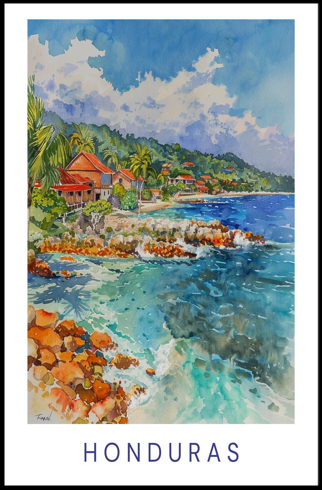 Bring a sun-drenched Honduran coastline into your home with this Honduras Coastal Scene Watercolor Travel Poster from PosterGoat. Rendered in luminous watercolors, the print captures turquoise waters crashing against rocky shores, lush greenery and swaying palm trees, and charming coastal houses nestled along a picturesque shoreline — an ideal piece of coastal decor for anyone who loves travel art and tropical landscapes.