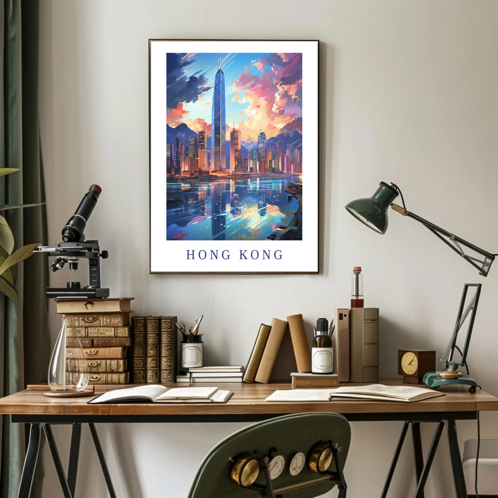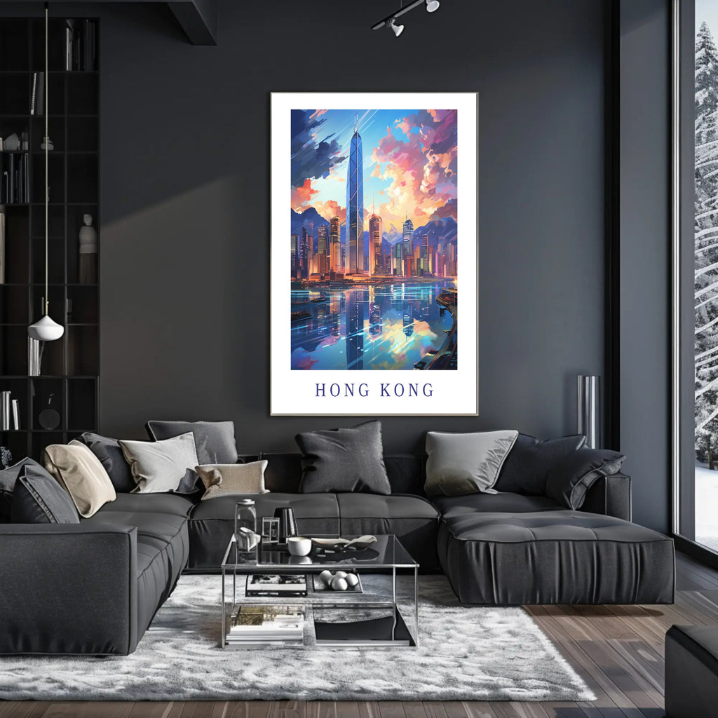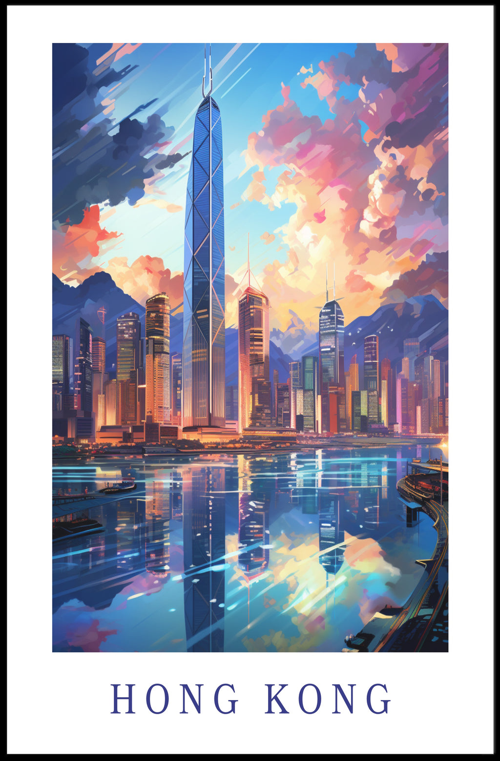 Experience the electrifying essence of Hong Kong with this captivating poster showcasing the city’s iconic skyline. Bathed in a colorful and dynamic sky, the skyscrapers rise majestically, mirrored beautifully in the waterfront below. The artwork’s modern and slightly surreal style combines bright, saturated colors with realistic, painterly techniques, offering a compelling visual spectacle that captures the vibrant life and optimism of this metropolitan hub. This piece celebrates Hong Kong’s unique blend of tradition and modernity, making it a perfect addition to any travel or cityscape-themed collection.
