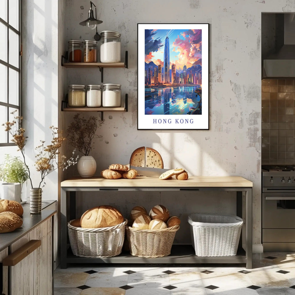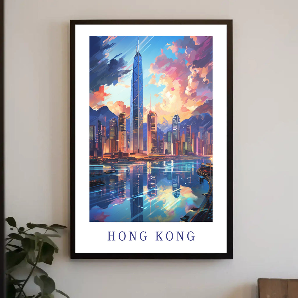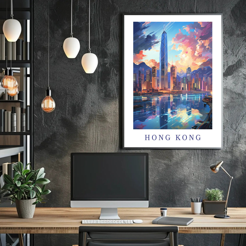 Experience the electrifying essence of Hong Kong with this captivating poster showcasing the city’s iconic skyline. Bathed in a colorful and dynamic sky, the skyscrapers rise majestically, mirrored beautifully in the waterfront below. The artwork’s modern and slightly surreal style combines bright, saturated colors with realistic, painterly techniques, offering a compelling visual spectacle that captures the vibrant life and optimism of this metropolitan hub. This piece celebrates Hong Kong’s unique blend of tradition and modernity, making it a perfect addition to any travel or cityscape-themed collection.