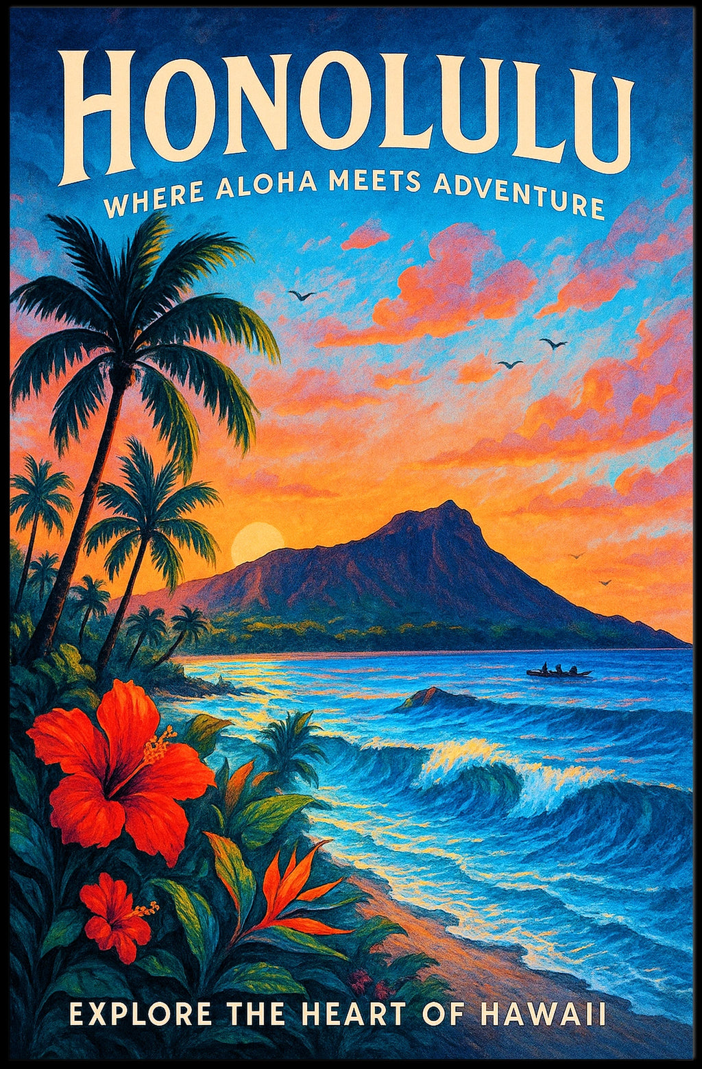 Bring a slice of Honolulu into your space with this Where Aloha Meets Adventure poster. A perfect fit for Home & Garden decor and posters collections, it adds warmth and wanderlust to any room. The design blends real-world scenery with a touch of Art Nouveau, giving a timeless look that's easy to mix with existing pieces. Sized at 18x24 inches, it's a breeze to frame and hang, so you can enjoy it right away.