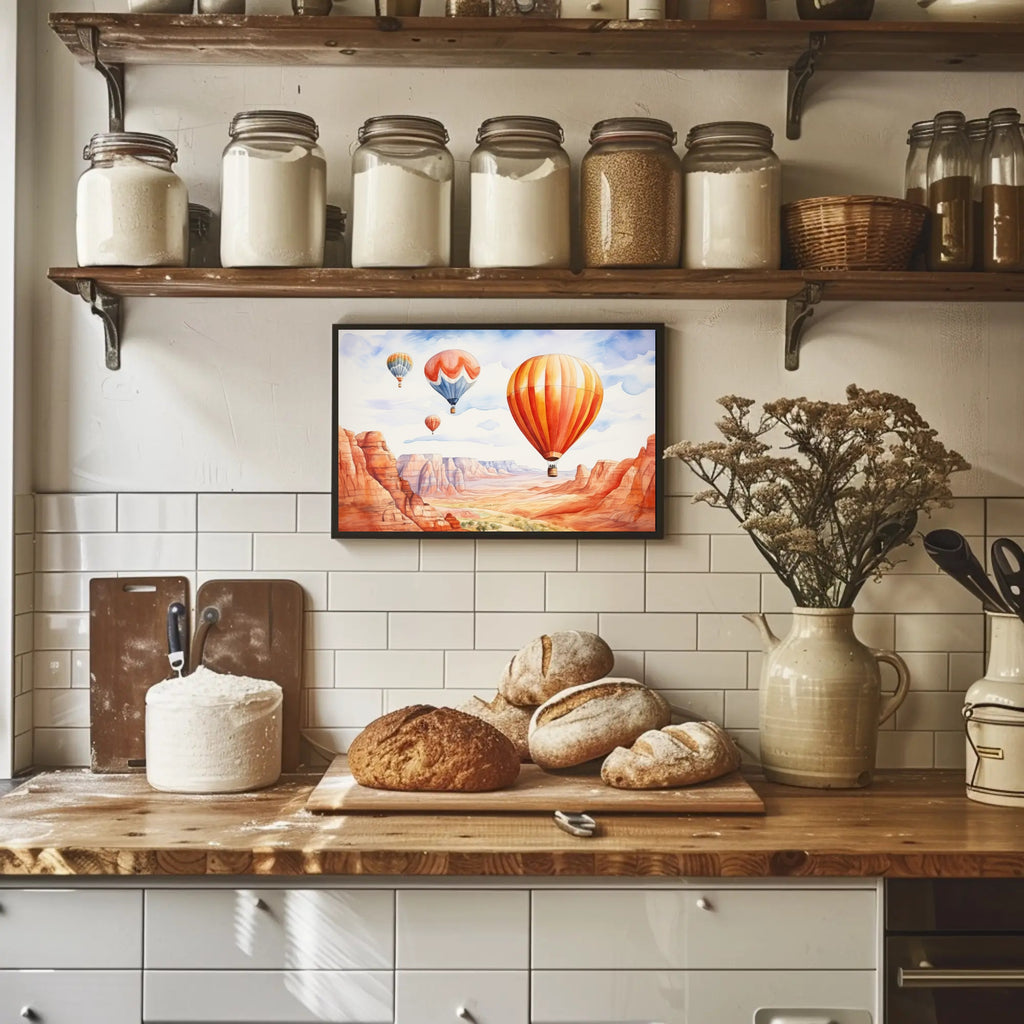 Stunning visual impact: Rich, watercolor-like textures and vivid colors create depth — from the glowing orange stripes of the foreground balloon to the layered red-rock canyons and soft blue sky.